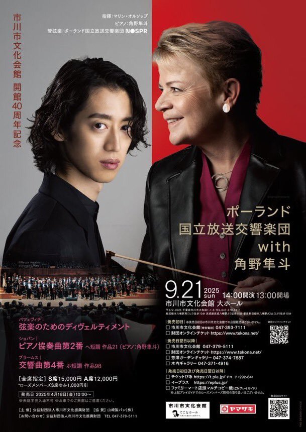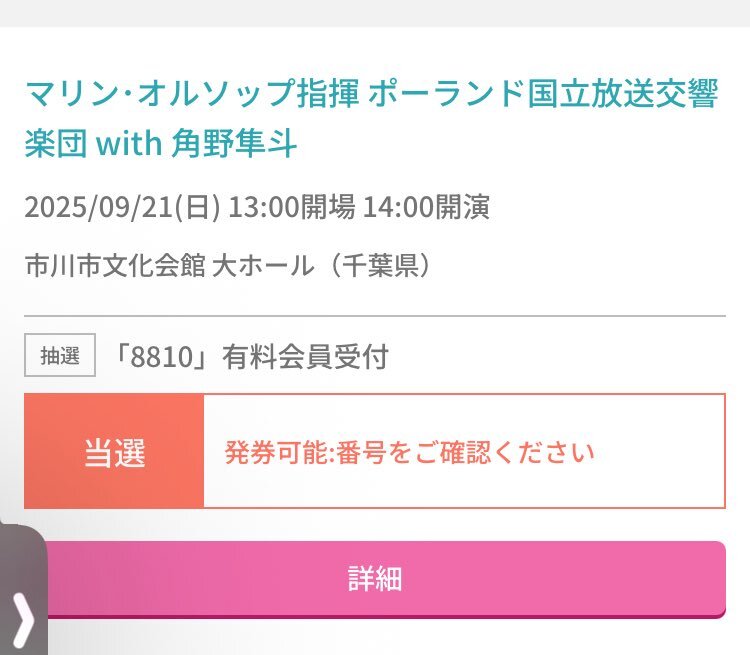 明日のコンサート、発熱のため行けなくなってしまいました😭😭😭 FC先行でチケット取りました。 S席、2枚どなたか行ける方いませんか? DMください。 #880hz #オルソップ #ショパンコンチェルト2番 #市川文化会館 pic.x.com/gqpj87M66j