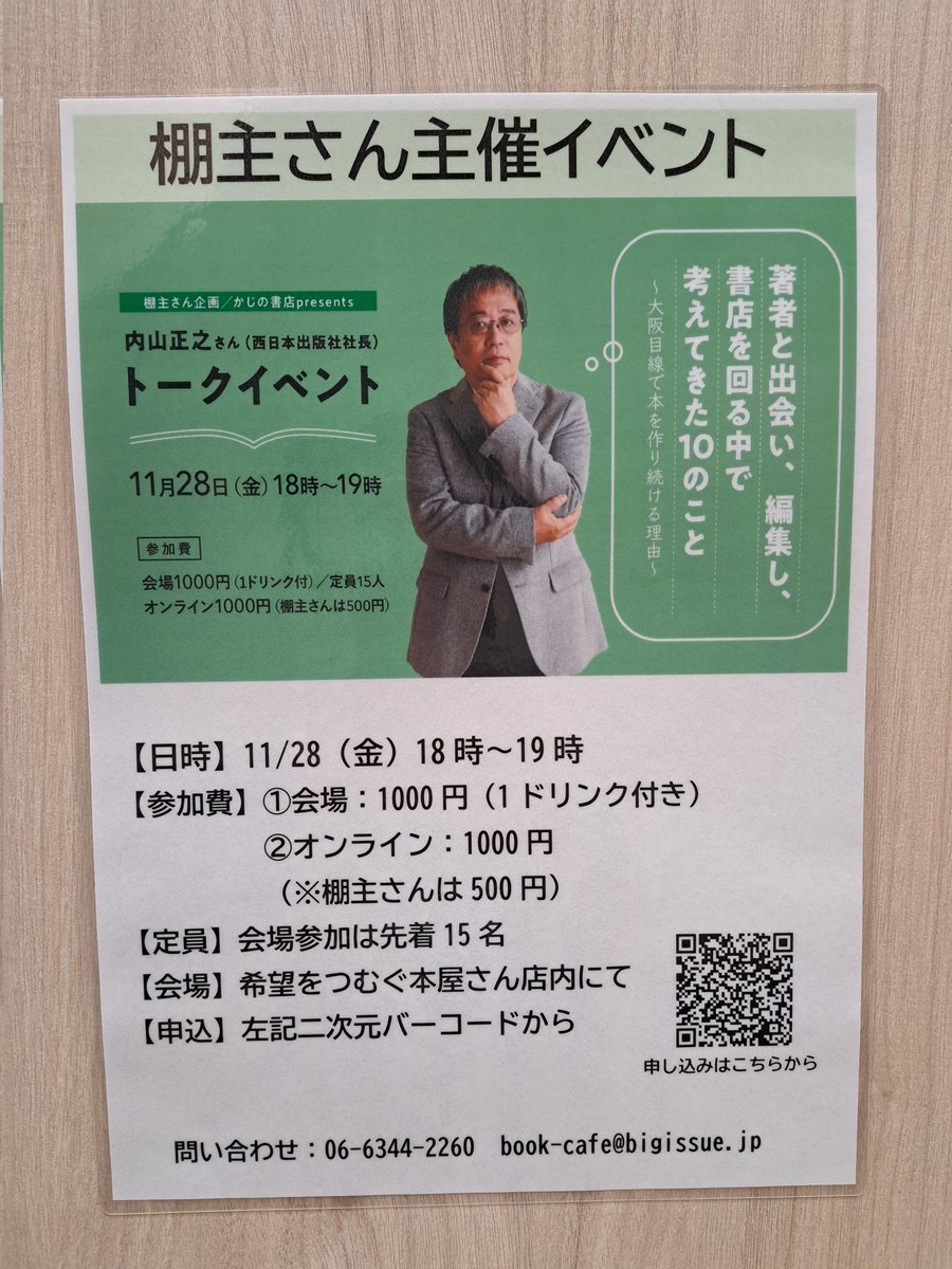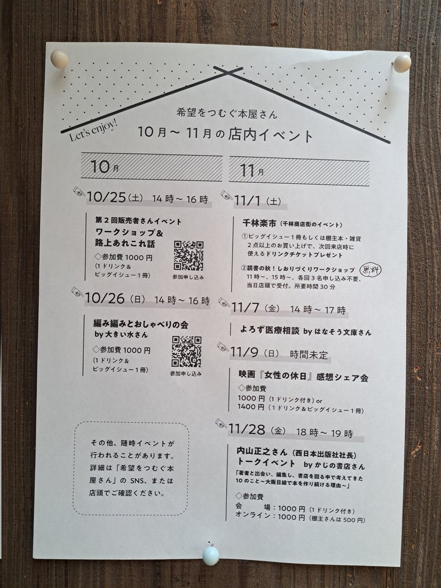 希望をつむぐ本屋さん オープンしてます! 11月の店内イベントもお知らせしたいけど… 本日午後は販売者さんイベント✨ 14時~15時、生駒のあの人が語りますよ! ビッグイシュー一冊とドリンク付きで1,000円です #希望をつむぐ本屋さん #ビッグイシュー #千林商店街 pic.x.com/HyTSbpvHOA