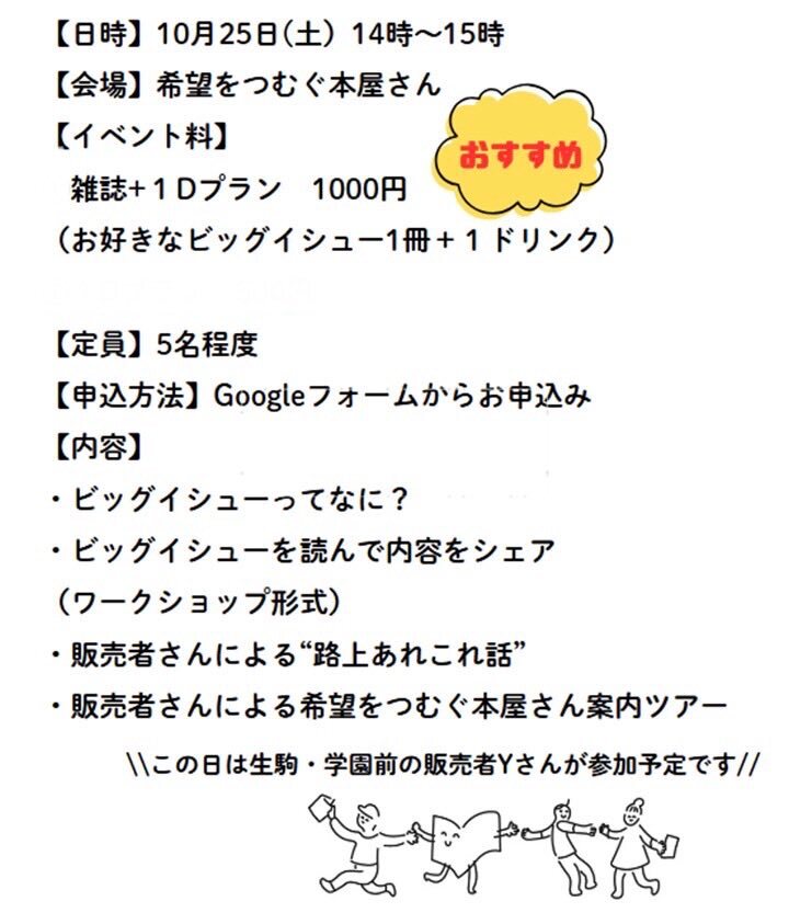 \\第2回販売者さんイベント// 10/25(土)14時〜、ビッグイシュー販売者さんとビッグイシューを読んでシェアして、路上あれこれ話をして…という盛り沢山なイベント。次回は奈良は生駒・学園前で販売されているYさんが参加🗣️ 申し込みはフォームから👉forms.gle/oA29FKJfVmn9KD…