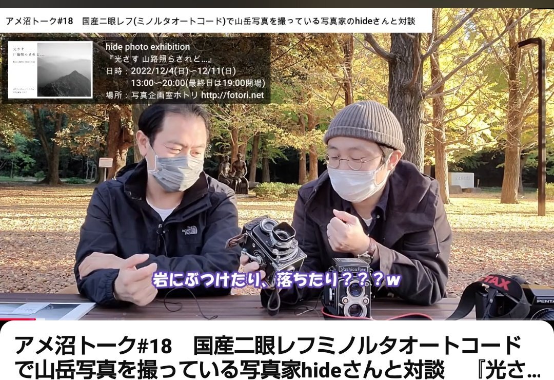 アメ沼トーク編集が大変すぎて最近撮ってないけども。昔hideさんと対談して、オートコードのすごい話をしてます(登山中に落としたとか) 面白いので是非🤭🤭🤭 youtu.be/B8QpjLACheY?si… #帰ってきた国産二眼レフ写真展 pic.x.com/YQbdiN3xu6