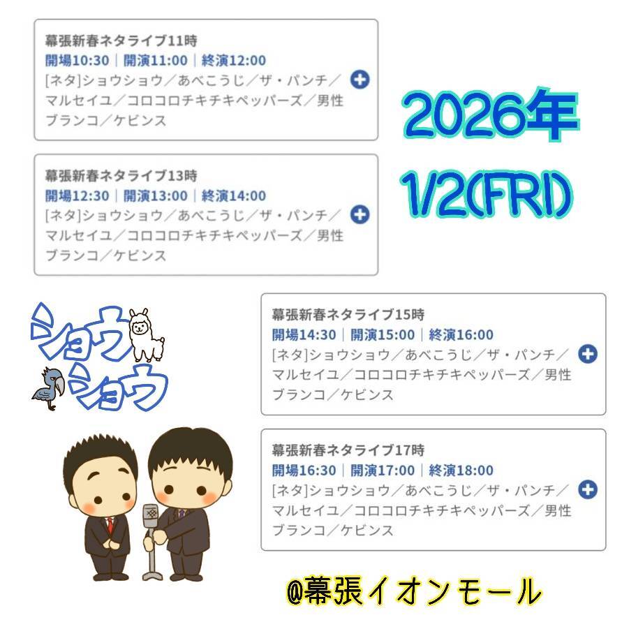 🔁2026年1月2日(金) よしもと幕張イオンモール劇場 幕張新春ネタライブ 11:00~/13:00~/15:00~/17:00~ 👤ショウショウ/あべこうじ/ザ・パンチ/マルセイユ/コロコロチキチキペッパーズ/男性ブランコ/ケビンス #ショウショウ #昇司 #昇平 #幕張よしもと FANY🎫x.gd/0102makuhari pic.x.com/uXi1FIA1IM