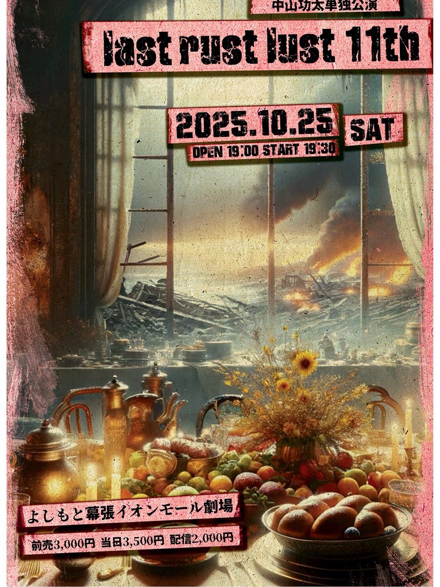 2025年10月25日 中山功太単独公演「last rust lust 11th」 開演19:30/終演21:00 前売発売中です。 時間の許す限り新ネタをやります。 皆様、是非お越し下さい。 #中山功太 #単独 #幕張よしもと #ピン #ピンネタ ticket.fany.lol/event/detail/7… pic.x.com/KEqR04NSah