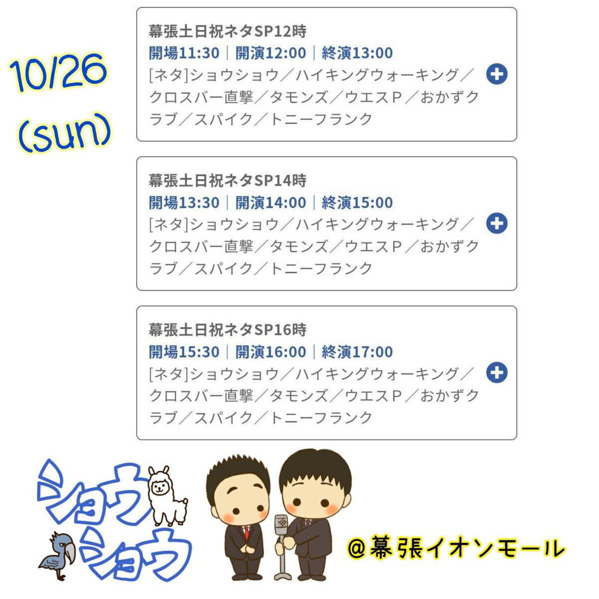明日!! 2025年10月26日(日) よしもと幕張イオンモール劇場 幕張土日祝ネタSP 12:00~/14:00~/16:00~ 👤ショウショウ/ハイキングウォーキングクロスバー直撃/タモンズ/ウエスP/スパイク/おかずクラブ/トニーフランク #ショウショウ #昇司 #昇平 #幕張よしもと FANY🎫x.gd/1026makuhari pic.x.com/dfwPdV46iu