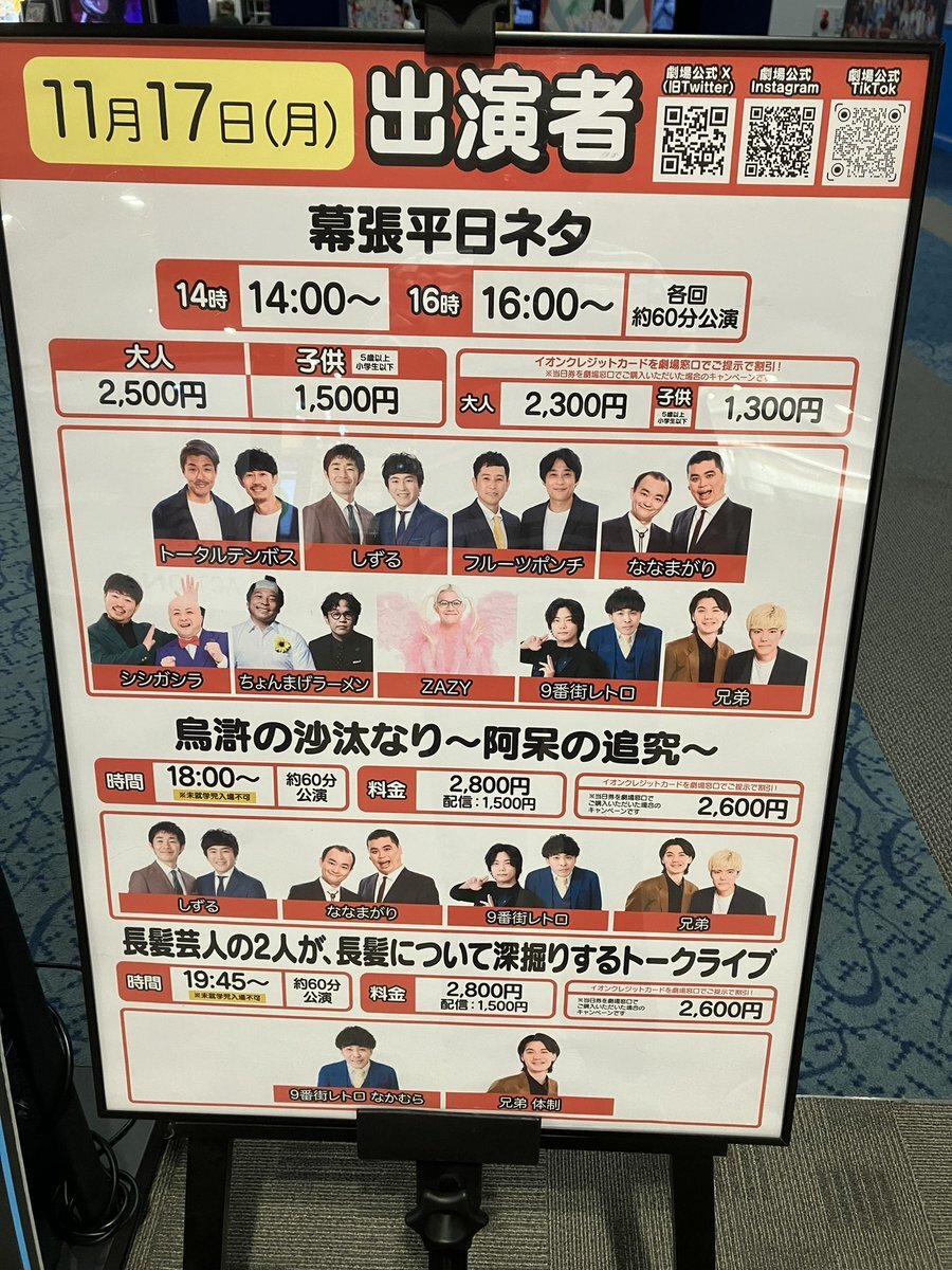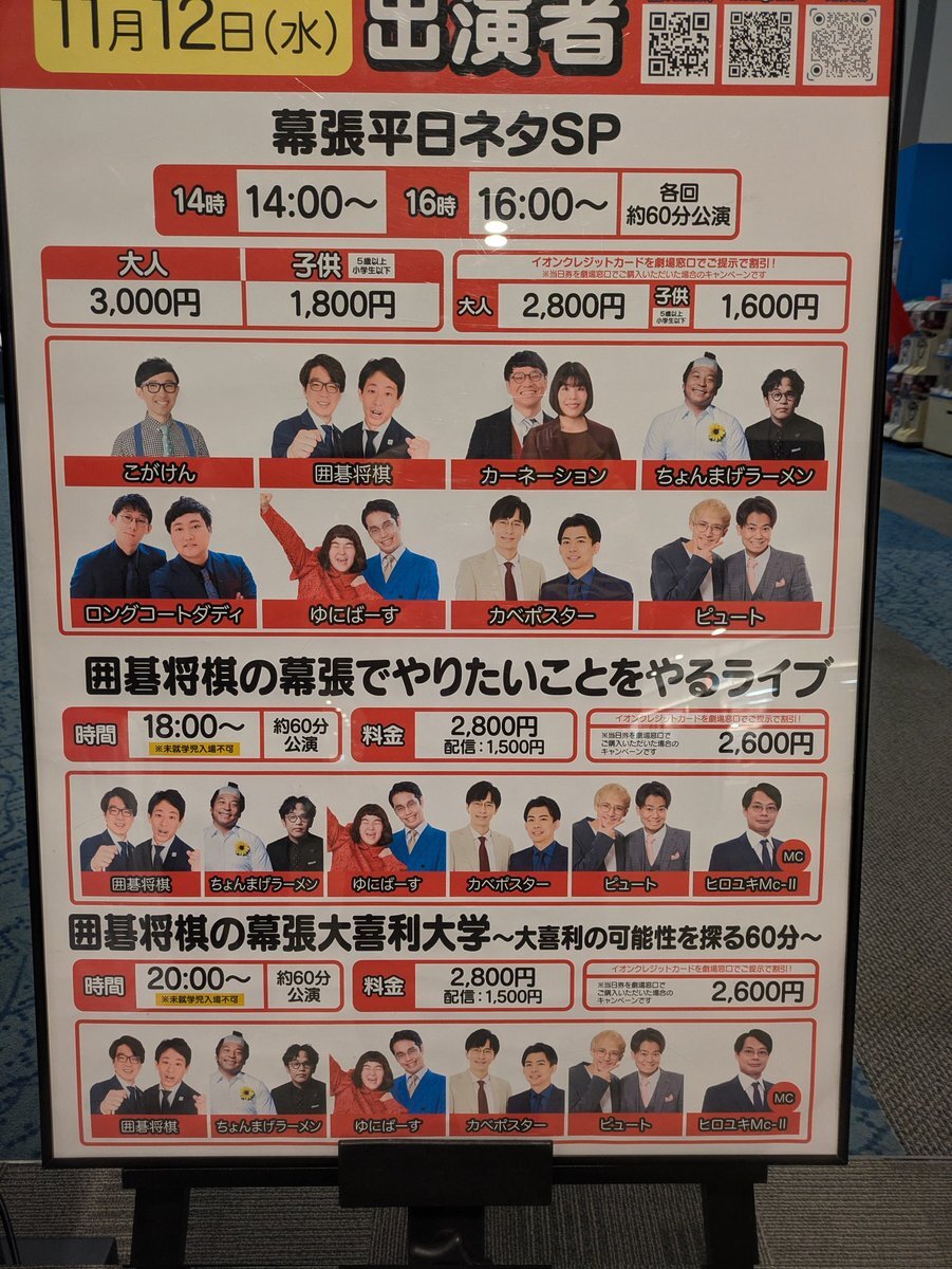 今日は行きたいライブがいっぱいあって…でも結局昼寄席! 明らかに空気が変わった瞬間があった!これがネタをやると漫才をやるとの違いかもと思った(よく分かりませんが)時期が時期だけに調整に調整のネタになるのはそうだし、改めて賞レース用の時間制限ある漫才って難しそう… #幕張よしもと pic.x.com/LVgwsSsX16