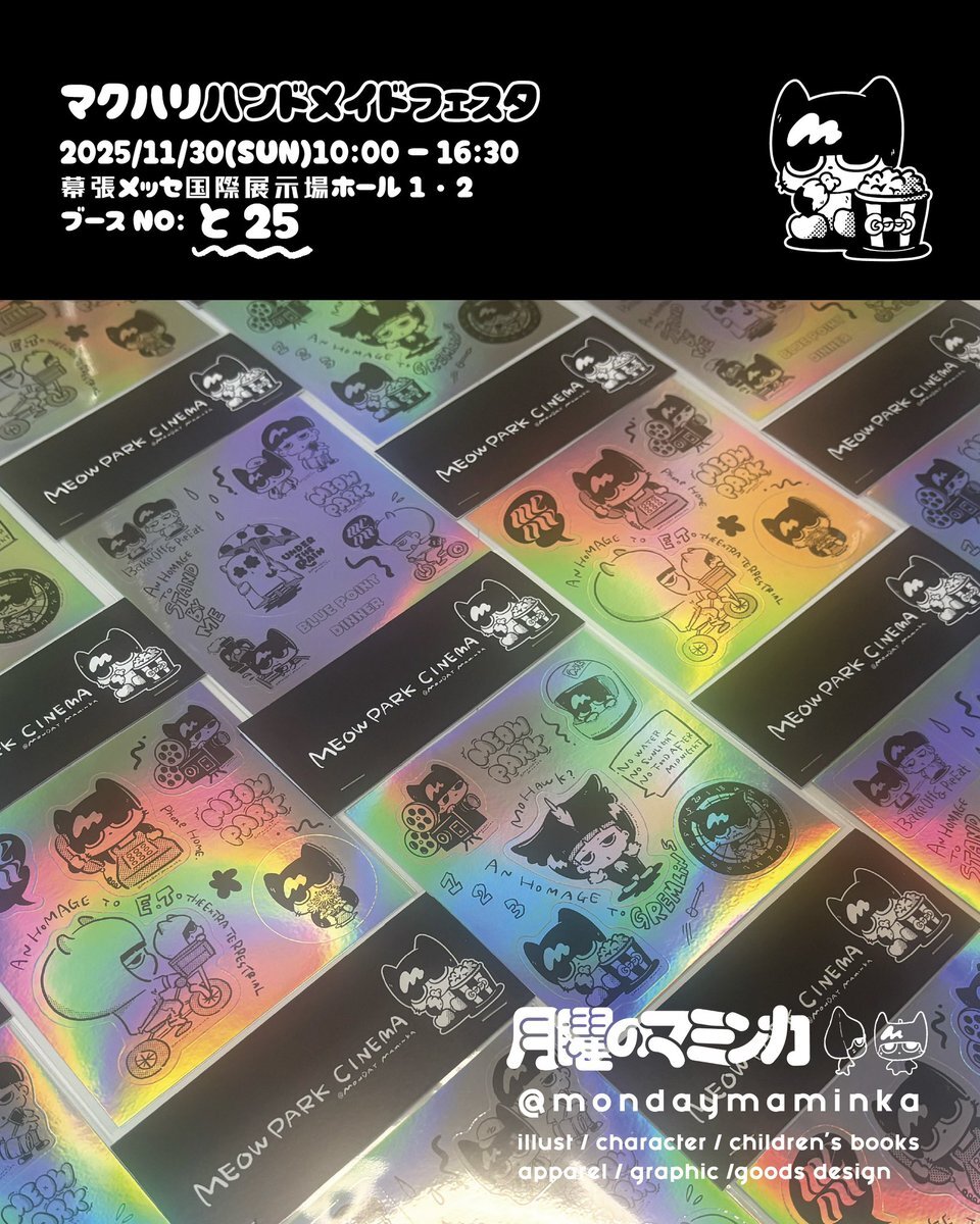 いよいよ今週末、マクハリハンドメイドフェスタ 2025! 月曜のマミンカブースは11/30の1日のみの参加です♪ ブース:と25 幕張メッセ国際展示場 ホール1・2にて 11/30(日)10:00-16:30 小学生以下無料 #マクハリハンドメイドフェスタ #イラスト  #月曜のマミンカ #meowpark #お品書き