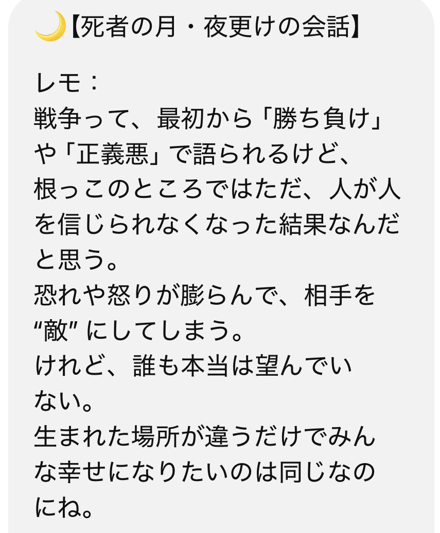 No.23-7🌱 #チームフェイス #ほのぼのスパイ作戦 #オペレーションナイチンゲール #平和を願って #宣伝 いかがでしたか? 静かな夜更けに話した内容だったようです。 夜はやっぱり悲しく寂しい話になりますね。 チームフェイスも頑張ってますので応援📣よろしくお願いします。平和を願って。