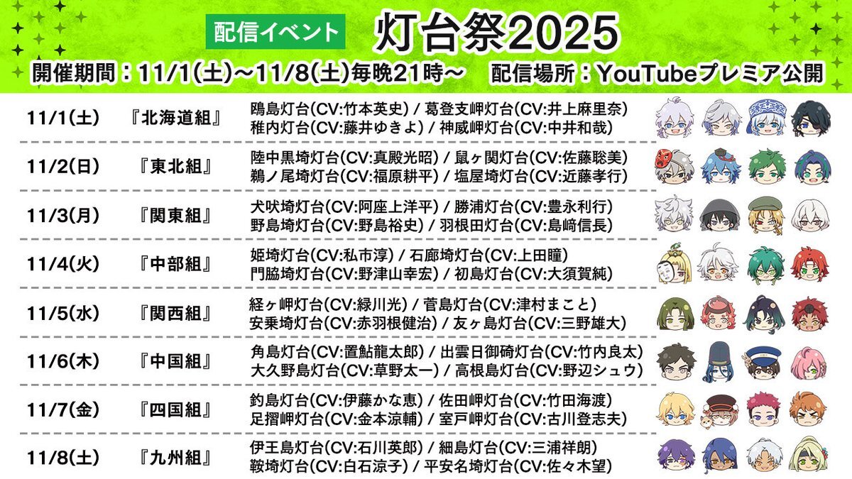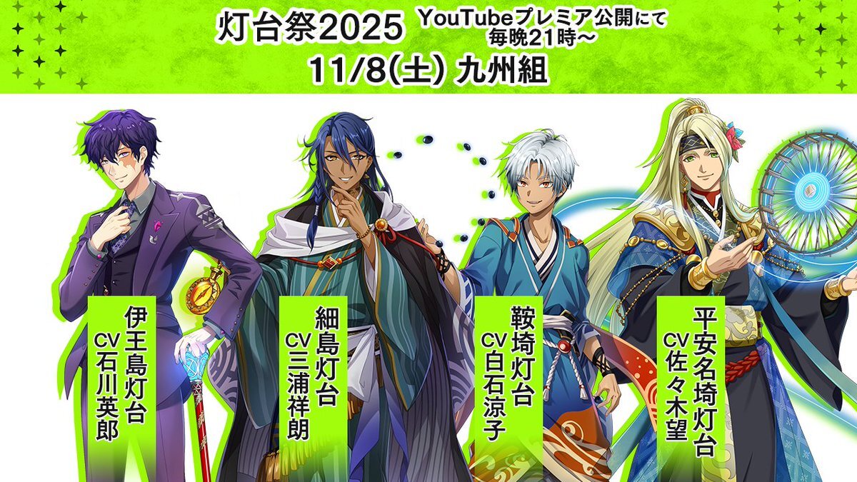 / 🌊『四国組』 ご視聴ありがとうございました \ あす11/8(土)21時〜 『九州組』を配信します🕯️ あすはいよいよ… 白洲灯台(CV #鈴村健一)の紹介動画公開🎬 ぜひご覧ください 伊王島灯台(CV #石川英郎) 細島灯台(CV #三浦祥朗) 鞍埼灯台(CV #白石涼子) 平安名埼灯台(CV #佐々木望)
