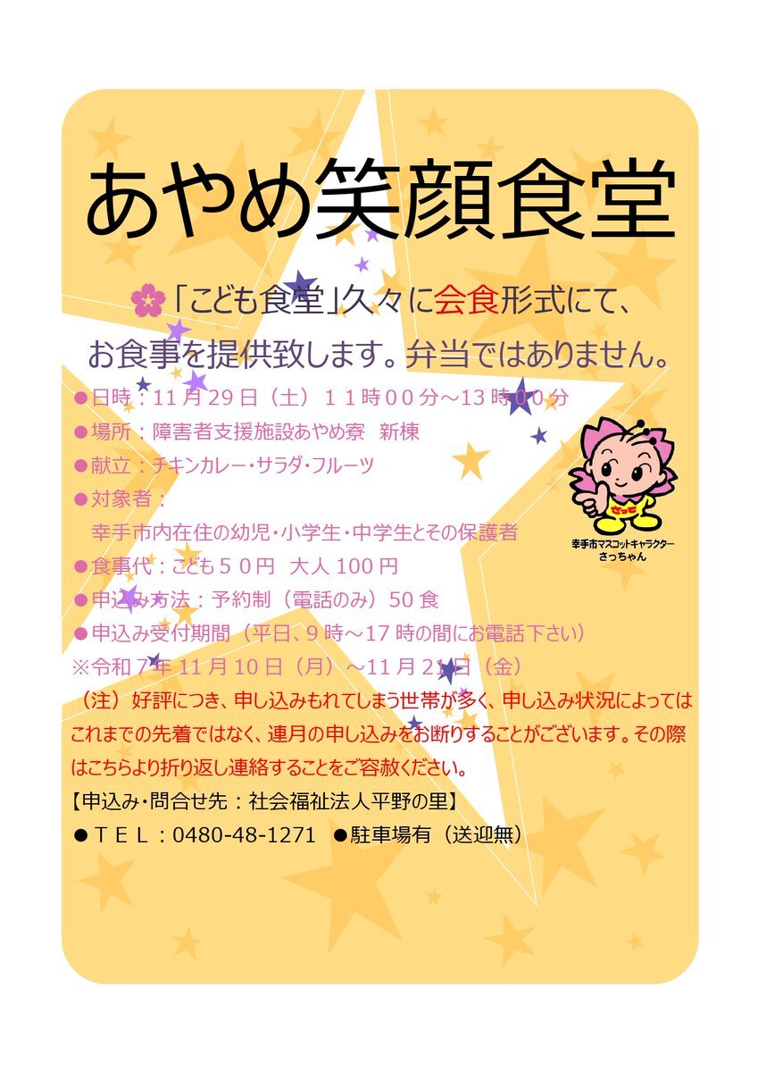 2025年11月29日開催 あやめ笑顔食堂の開催のお知らせ 11月も元気に開催を予定しております。 今月は久々の会食形式‼ 完全予約制11月10日~21日 平日9:00~17:00の間にご連絡ください‼ #このまちが好き幸手市 #あやめ笑顔食堂 #社会福祉法人 #平野の里 #あやめ寮 #子ども食堂 #フォロー歓迎 pic.x.com/0BBDVLTOOs