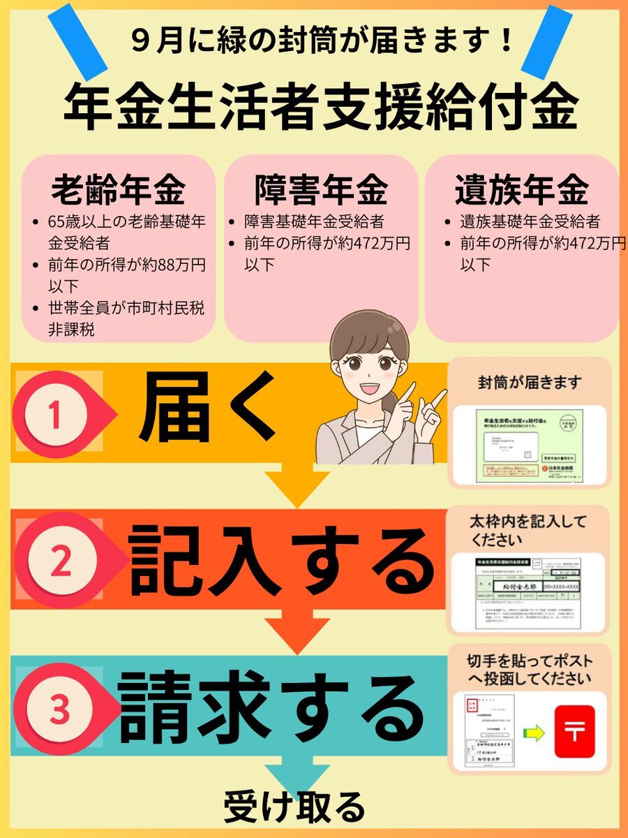 『年金生活者支援給付金』の緑の封書。そのままにしないでください。対象者に届きます。年金に+6.5万円。必要や書類を書いて提出するだけ!注意点は... #年金生活者支援給付金 pic.x.com/3R9dCAg0JS