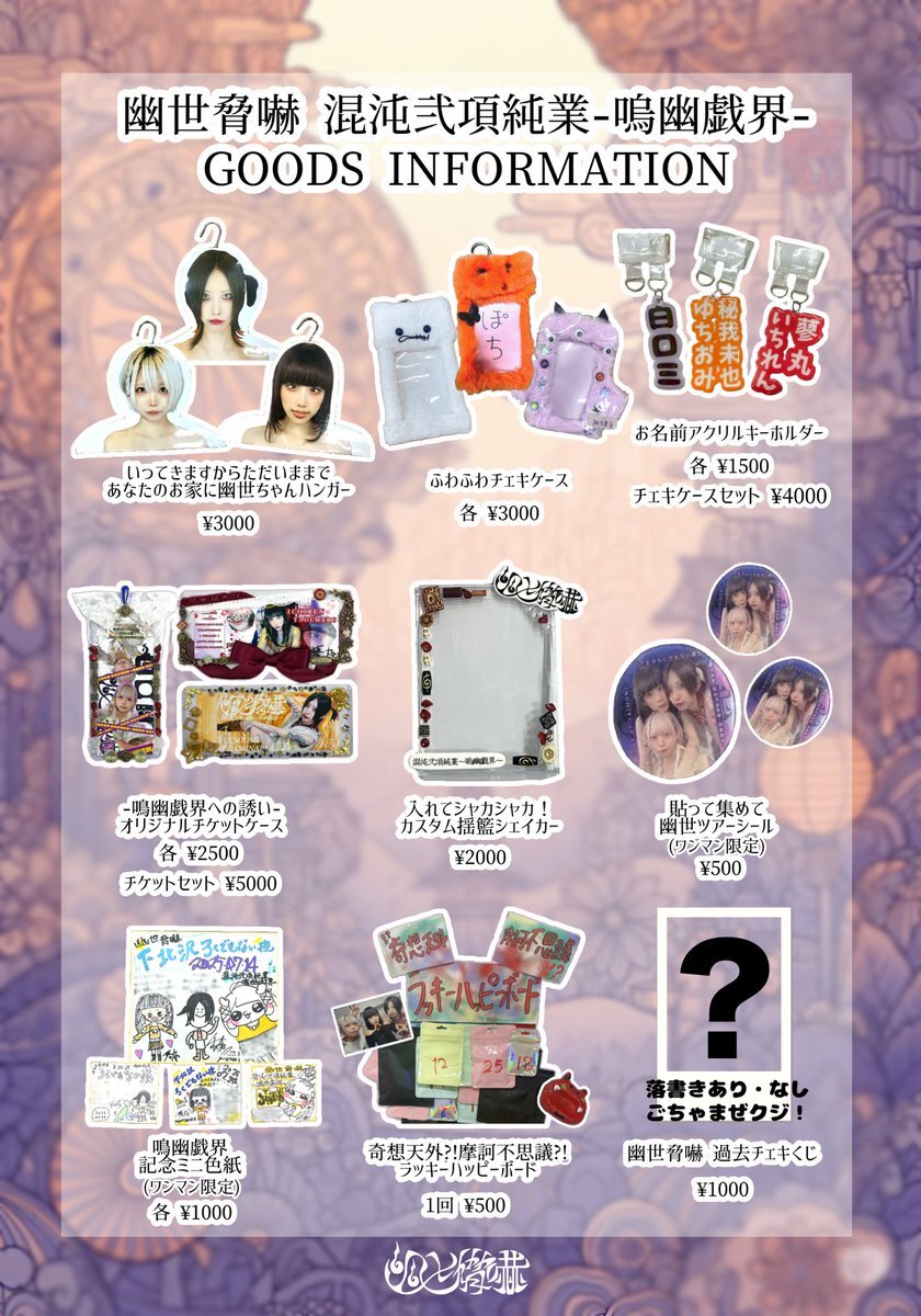 🪩GOODS INFORMATION🪩 本日 #幽世嗚幽戯界 ツアー限定グッズ有り‼️ ・嗚幽戯界記念ミニ色紙 ¥1,000 ・貼って集めて幽世ツアーシール ¥500 ・奇想天外?!摩訶不思議?!ラッキーハッピーボード ¥500 12/21 ファイナル公演手売りチケットも絶賛販売中🎫 .· 是非お買い求めください✨️ #幽世脅嚇 pic.x.com/7ZcWlB7SBw
