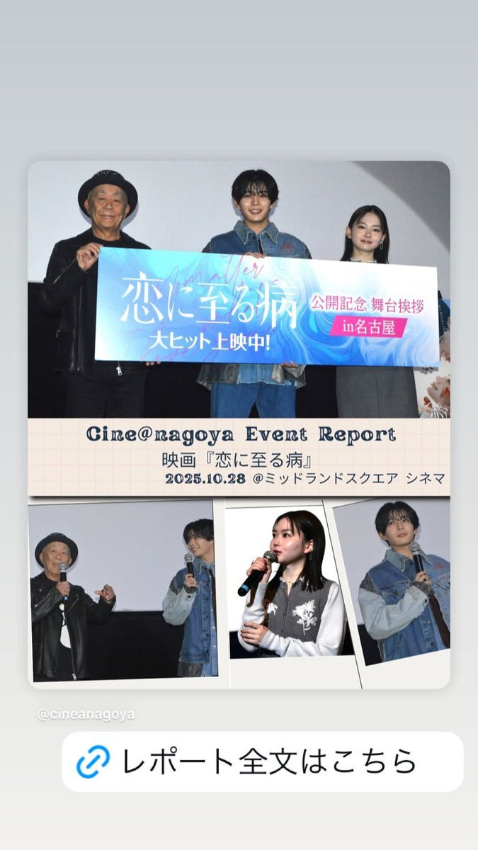 〈Event Report〉 映画『#恋に至る病』舞台挨拶in名古屋 #長尾謙杜 さんと #山田杏奈 さん、#廣木隆一監督 が登壇 「愛知といえば?」の質問、廣木監督「ふたりの芝居を見ているのが心地いい」、長尾さん「#なにわ男子」ライブ打ち上げ、映画撮影中の伝説の食事会を語る 全文 cineana.net/archives/20724 pic.x.com/5MNsNLk2Co