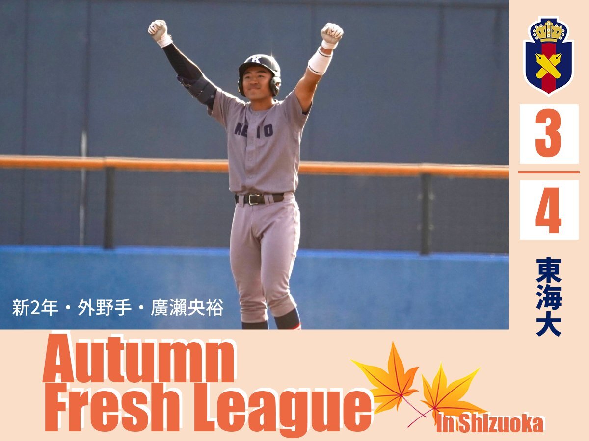 【第8回大学野球オータムフレッシュリーグ試合結果】 ●慶大(新人戦) 3-4 東海大 慶 000 000 30 = 3 東 000 210 01x = 4 ※大会規定により8回打ち切り #廣瀨央裕 の適時打で同点に追いつくも、最終回に勝ち越しを許し、敗戦…。 pic.x.com/yNWp7IS8Xo