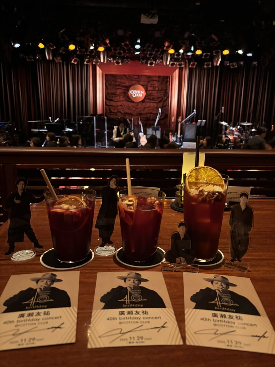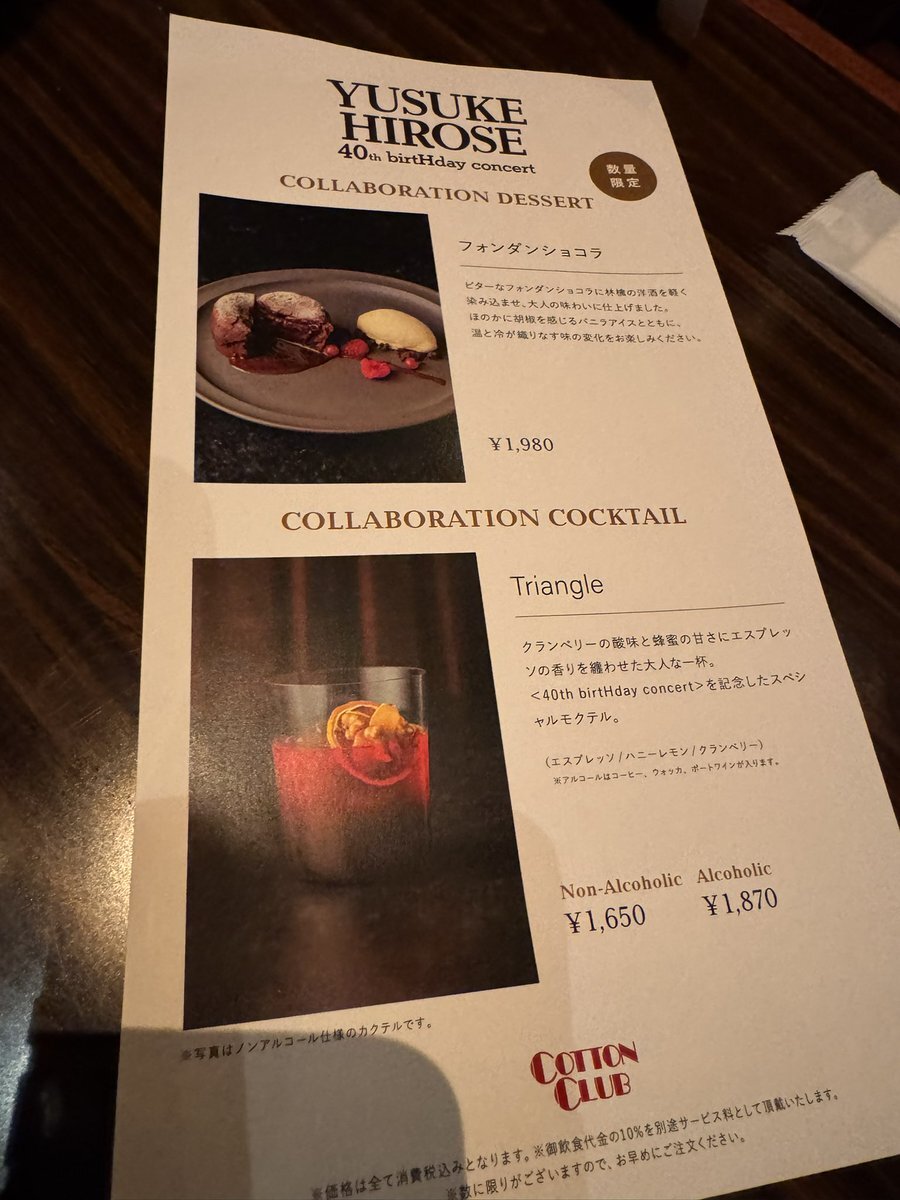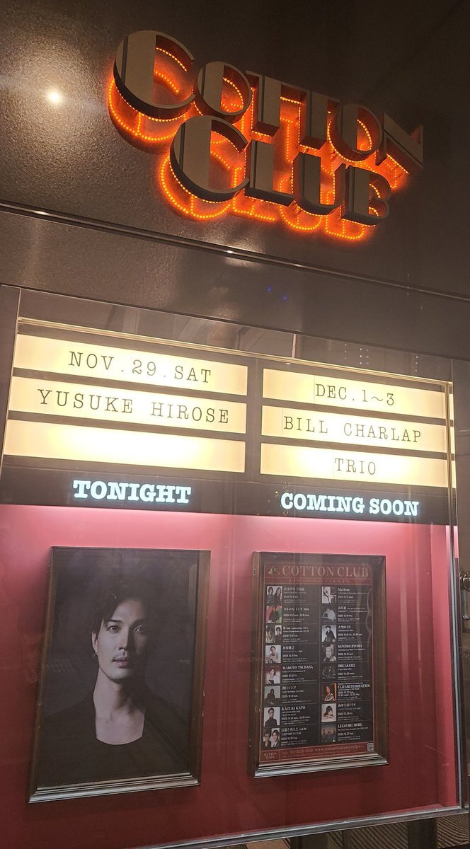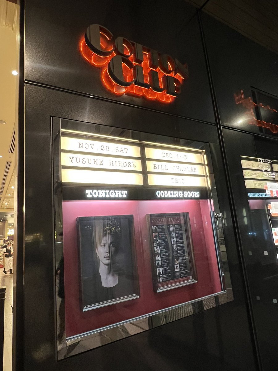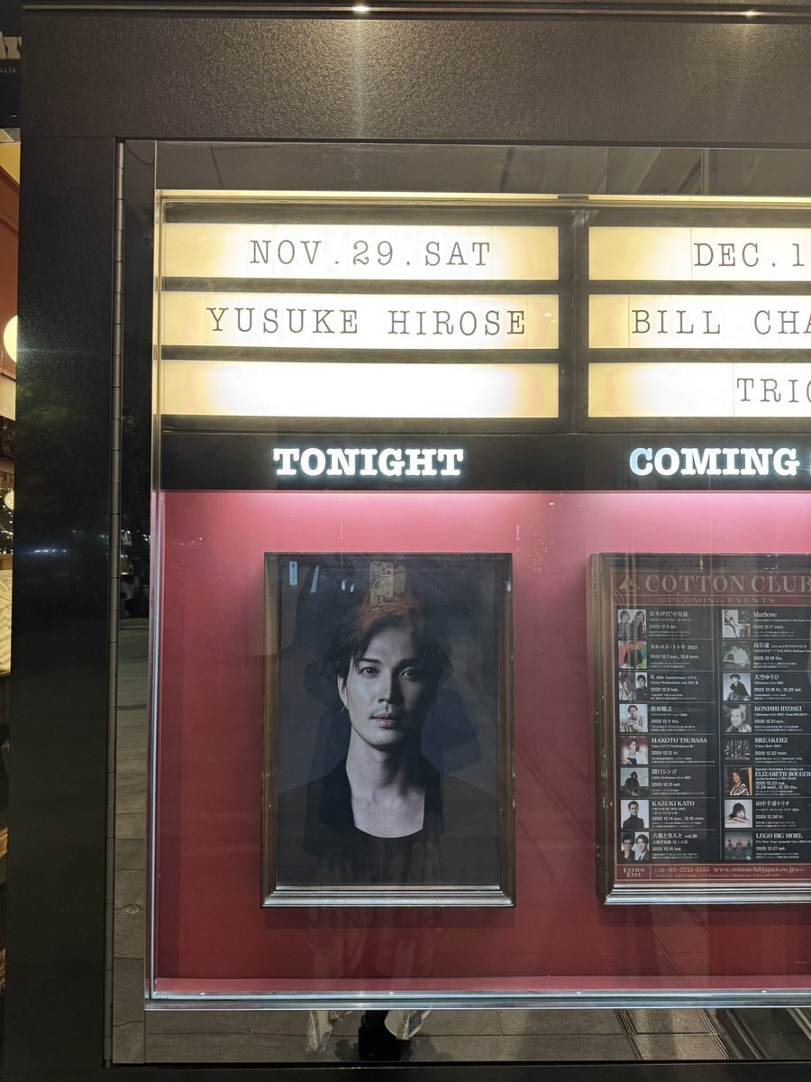 そう、今日はヒロくんの40TH BIRTHDAY LIVEに来ております✨ Cotton Clubとかお初に伺ってます✨ (いい写真スポット通らずに入ってしまったので💦とりあえずフライヤー並んでたところを…) #廣瀬友祐 pic.x.com/EqmMDkAn3D