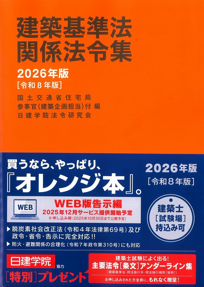 新刊案内 書 名:建築基準法関係法令集 2026年版 令和8年版 出版社:#建築資料研究社 定 価:3,080円(本体2,800円) 11月14日入荷 販売中! 建築士試験受験者、設計・施工者、確認・検査実務者のための[建築系]法令集 kskpub.com/book/b10146422… お求めは gov-book.or.jp/book/detail.ph… #建築基準法 pic.x.com/iNpZYzbG7e