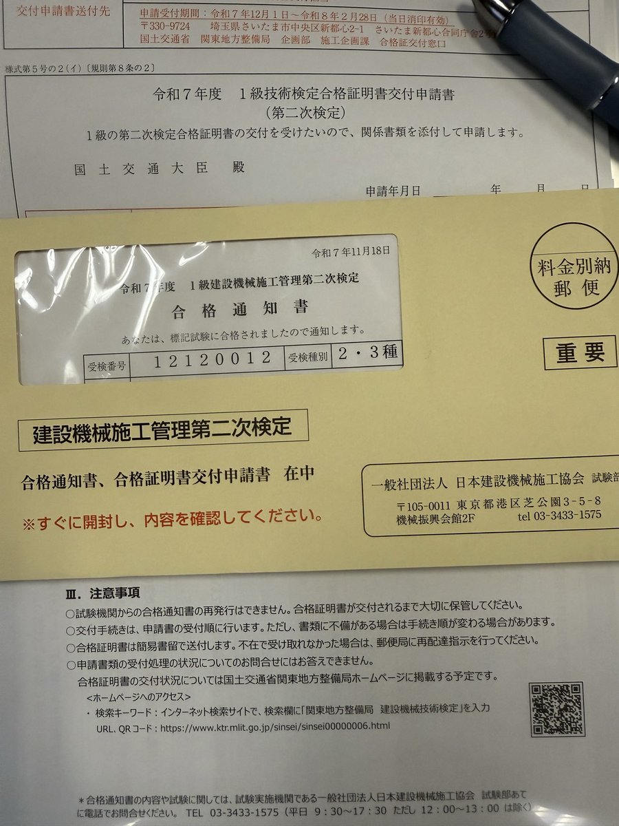 昨日、1級建設機械施工管理2次検定合格通知書・証明書交付申請書が届き、家内からも祝福の言葉を貰い、💐合格した達成感を味わえました‼️ これでまた、手当て増額だなぁ👍 #1級建設機械施工管理技士 #建設機械 pic.x.com/H6hEwSpmjU