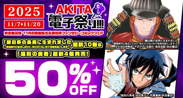 【電子書籍】 11/20迄 🍃2025年度AKITA電子祭り冬の陣🍃 「#織田家の長男に生まれました」最新10巻&「#廻刻の勇者」最新4巻発売🌟 戦国転生&異世界ファンタジーコミックフェア開催🎊 今だけ50%OFF🎶読み逃しのないよう注意です💗 詳細⬇️ melonbooks.co.jp/cplus/tags/ind… pic.x.com/mBzXygKp6a