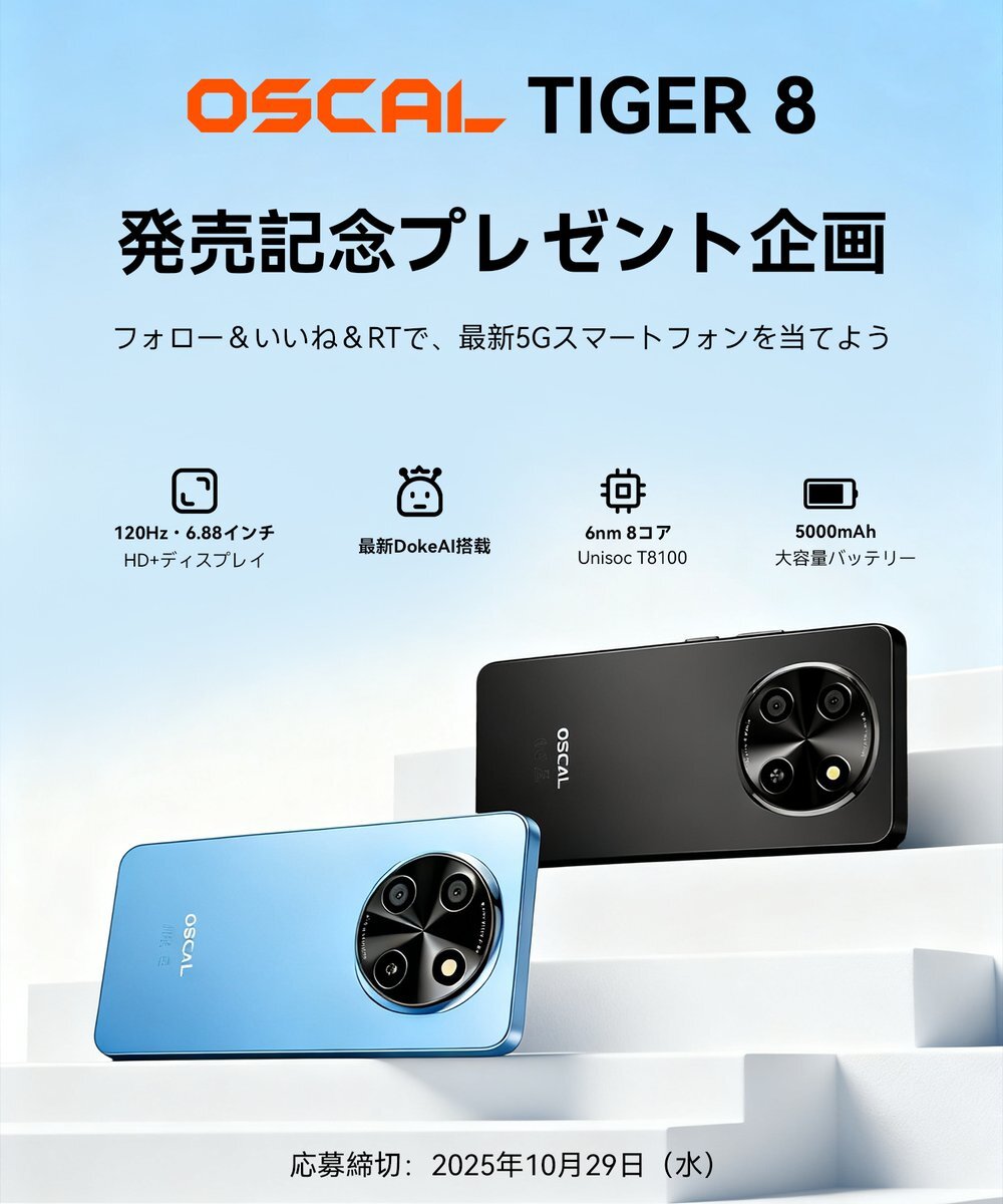 📢OSCAL TIGER 8 発売記念プレゼント企画 開始🎉 フォロー&いいね&RTで、最新5Gスマートフォンを当てよう! 抽選で2名様に「OSCAL TIGER 8」をプレゼント📱 ✨詳細はこちら🔗 :geni.us/NuGAUC0 📌応募方法 1️⃣ @OscalJapanをフォロー 2️⃣ 本投稿をいいね&RT