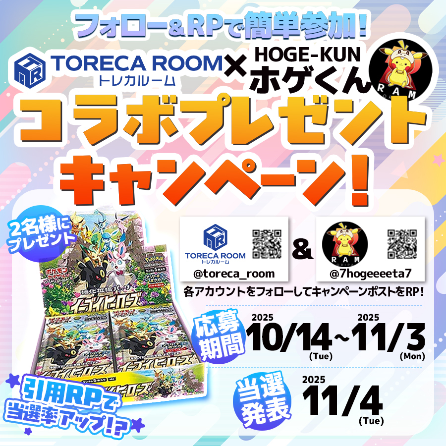 👑TORECA ROOMオープン記念コラボ👑 TORECA ROOM×ホゲくんコラボ開催! フォロー&リポストで高額BOXを手に入れろ🎉 抽選で2名様にイーブイヒーローズが当たる🎁 ✅参加方法はこちら 1:@toreca_room & @7hogeeeeta7 をフォロー 2:このポストをリポストして応募完了