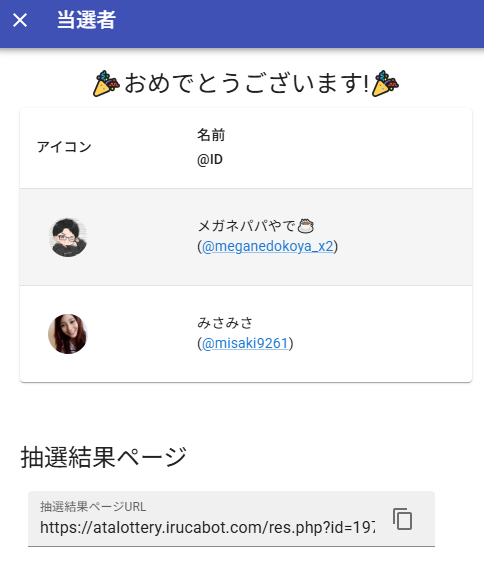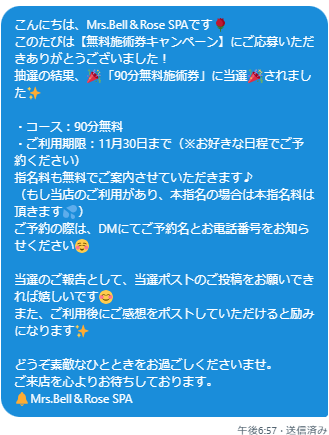 🎉【無料券当選者発表】🎉 たくさんのご応募ありがとうございました✨ 抽選の結果、当選者の方が決定いたしました! 120分無料券 @3h5jpnkl8x98011 90分無料券 @kabigon_puni 後ほどDMにてご連絡させていただきました💌 どうぞお楽しみに💐 #MrsBellRoseSPA #堺東 #当選発表 pic.x.com/4kBbu20mqE