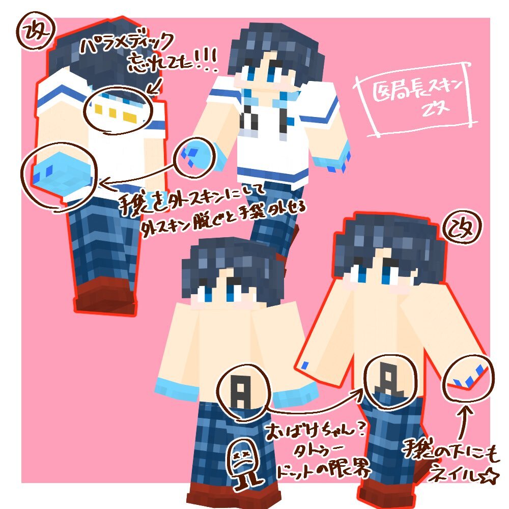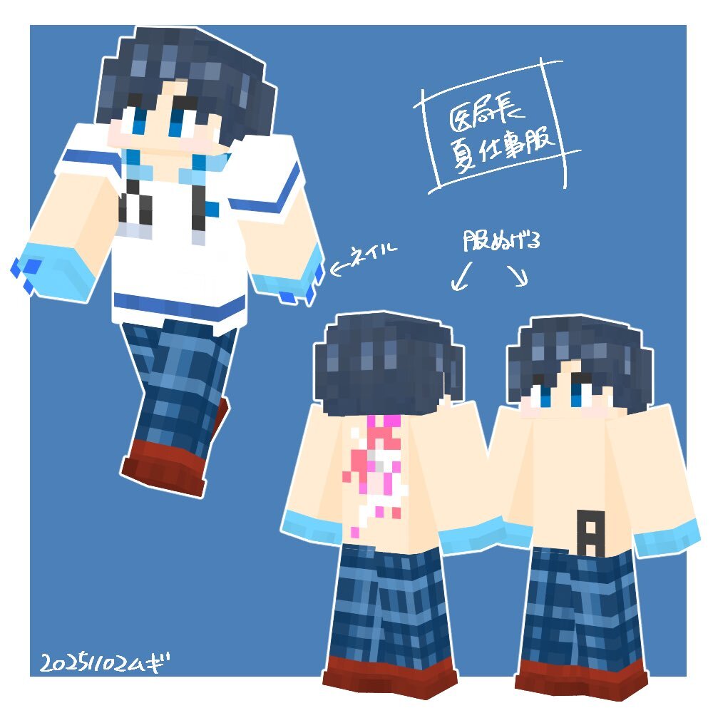 マイクラ救急隊サーバー楽しい☺️ キャラのスキン作ってみたかったので、医局長夏服ver.作れて楽しかったー✨ #影絵と書いてファンアートと読ませたい
