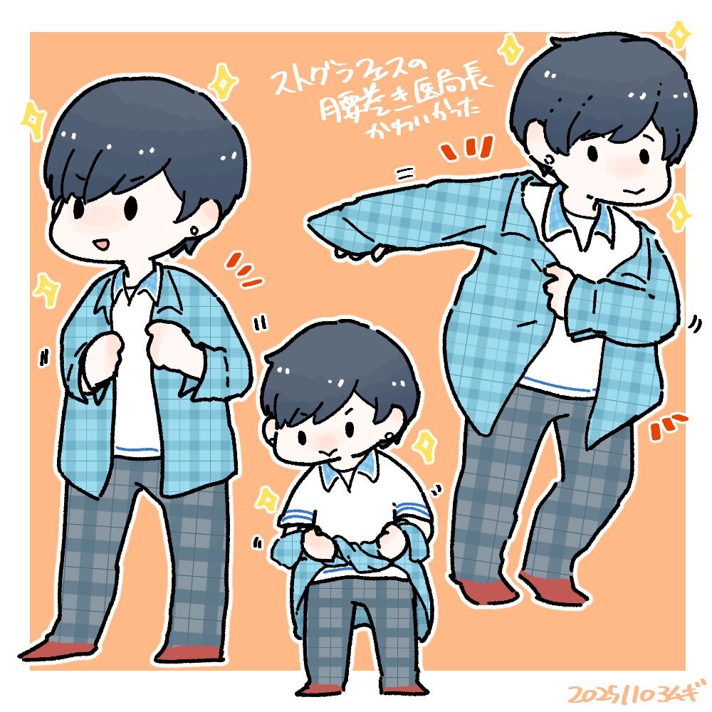 ストグラフェスの腰巻きチェックシャツ医局長無限に可愛くて好きなんですが☺️ これ着たらチェック&チェックになる事に気づいて、医局長の服センスとして解釈一致すぎて天才だなって思いました😌👏 ドヤ顔で羽織って欲しい😂 #影絵と書いてファンアートと読ませたい pic.x.com/2Vbv2ad3td