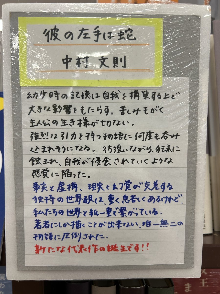 啓文社ホームページ 「いつか読書をする人へ」 更新しました。 『#彼の左手は蛇』 著者:#中村文則 出版社:#河出書房新社 keibunsha.net/details/recomm… #書店員おすすめ pic.x.com/hrclCFO3OU