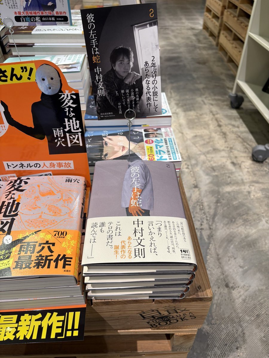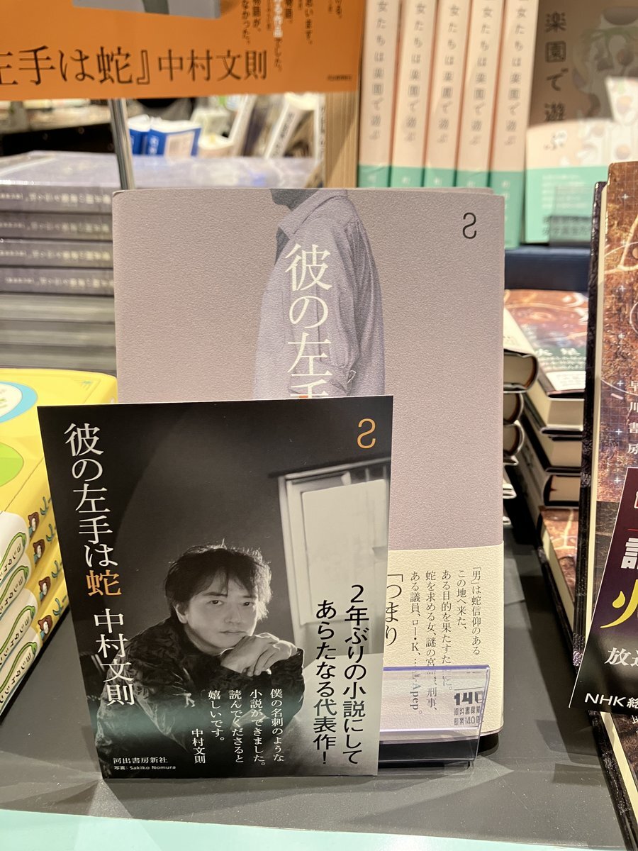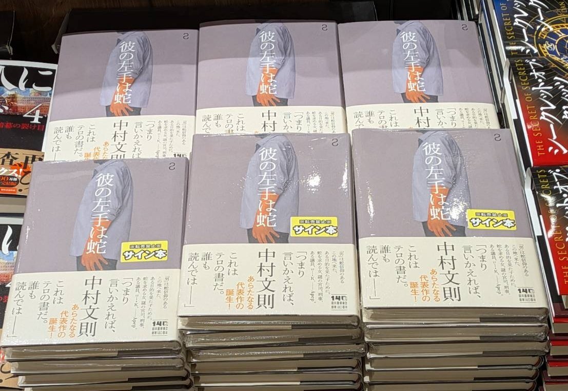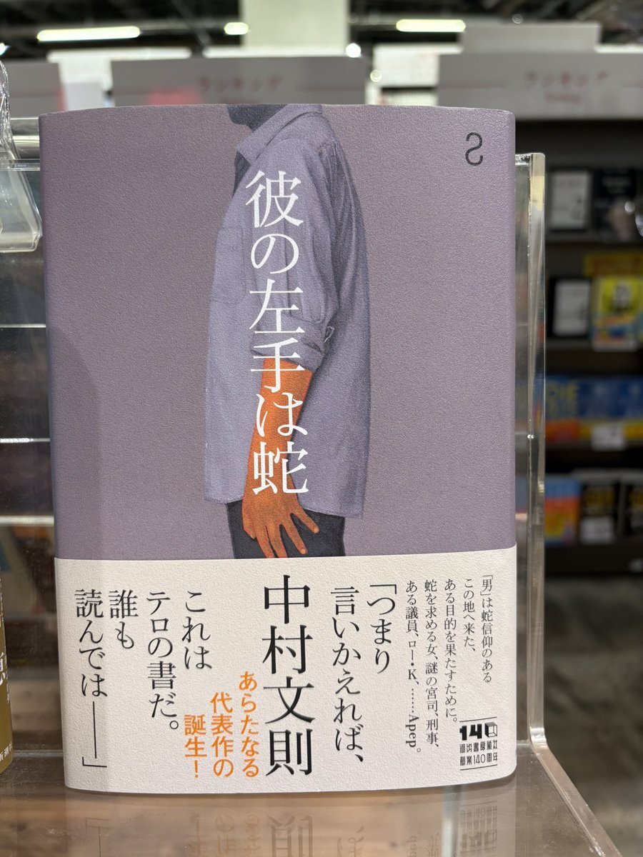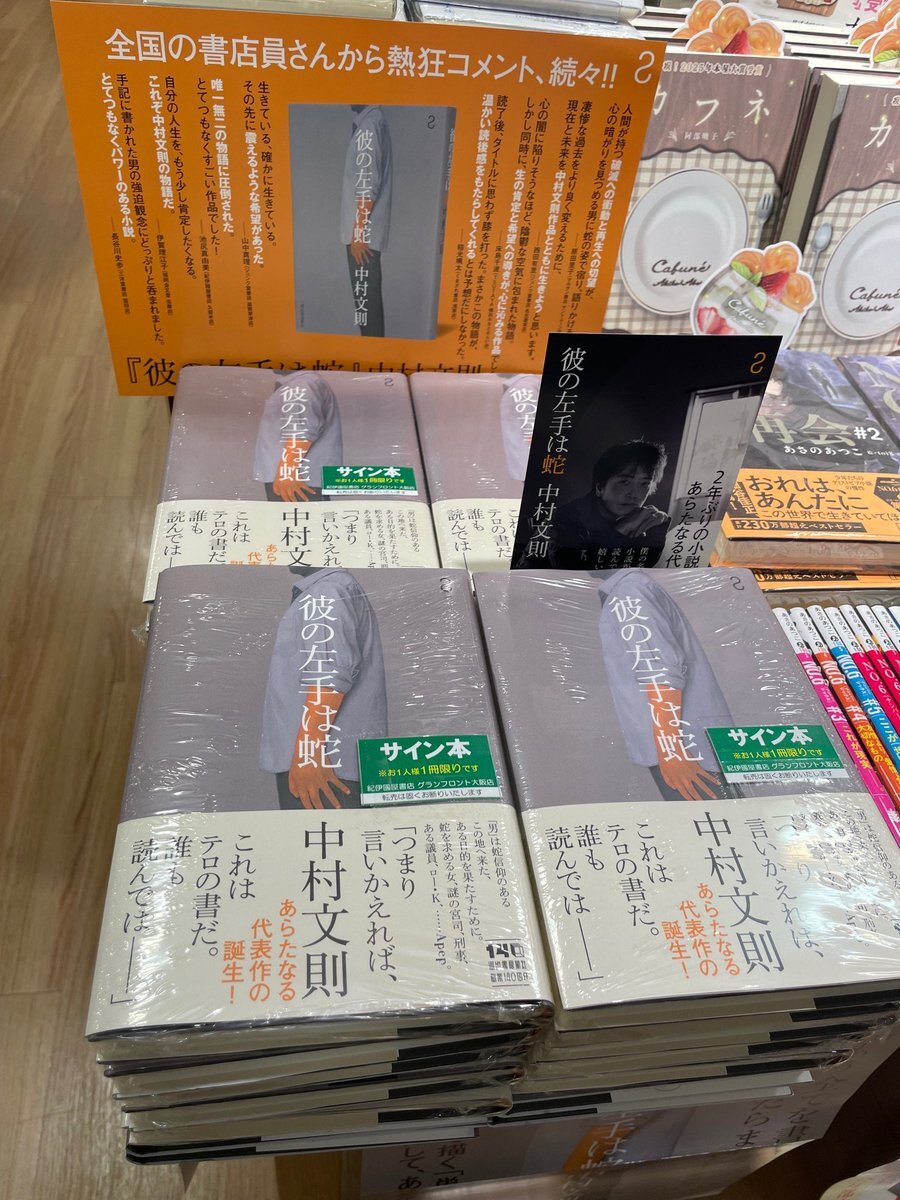 【文芸】 #中村文則 さんご来店✨ 最新刊『#彼の左手は蛇』(#河出書房新社) のサイン本を作成していただきました🐍 宗教、神話…2年ぶりの新刊は蛇にまつわる物語 〈これはテロの書だ。誰も読んではー〉 文芸・国内小説コーナーにて展開中📚 pic.x.com/qjUvPJuoal