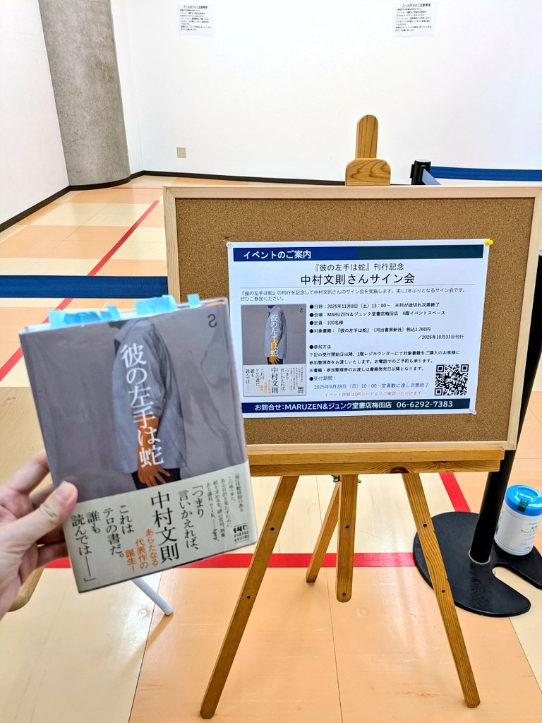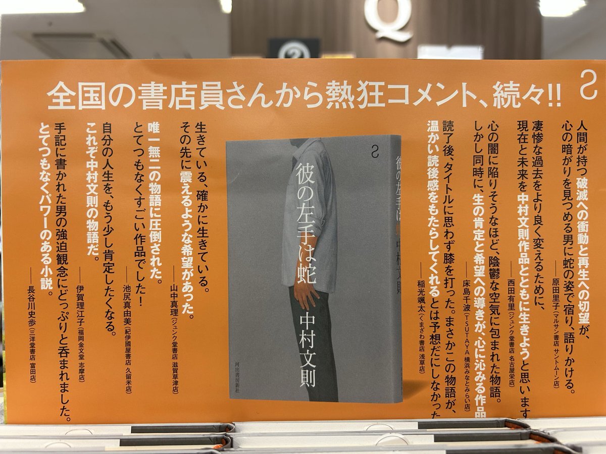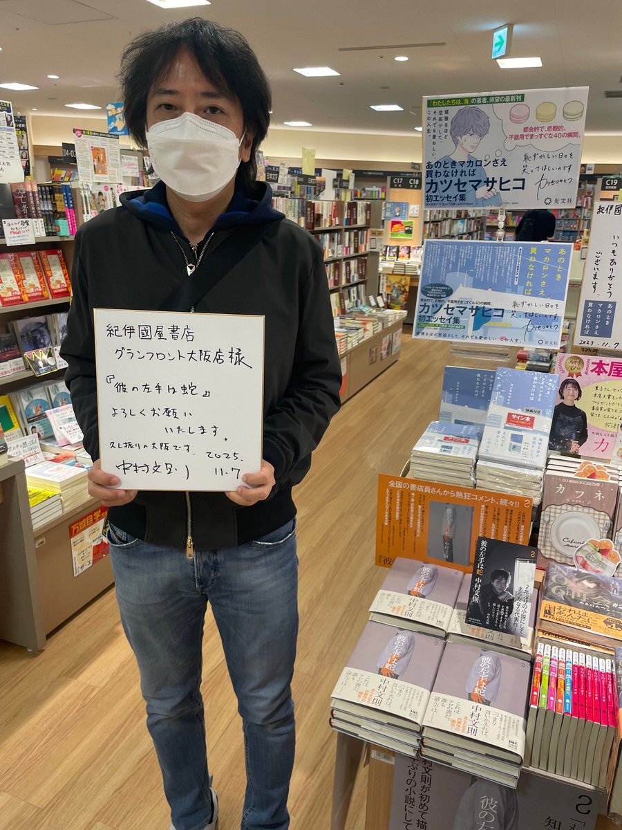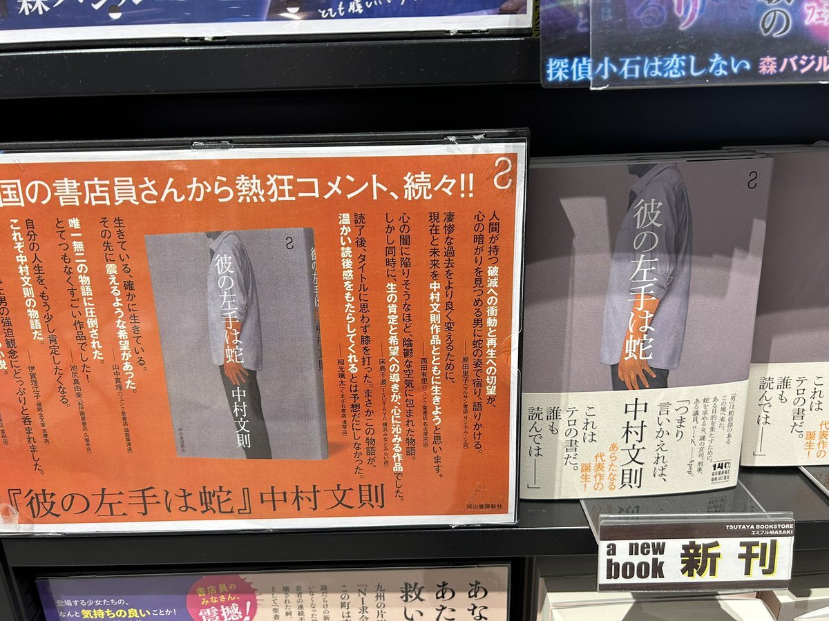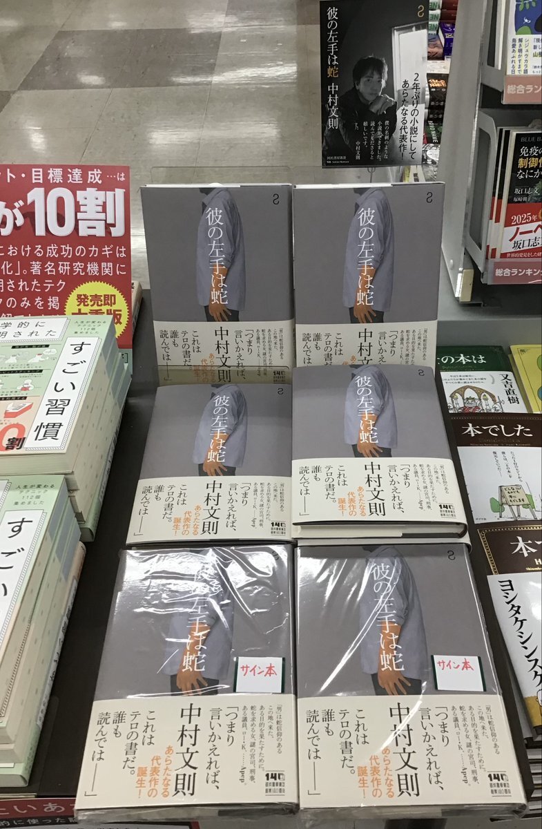 【文芸】 #中村文則 さんご来店✨ 最新刊『#彼の左手は蛇』(#河出書房新社) のサイン本を作成していただきました🐍 宗教、神話…2年ぶりの新刊は蛇にまつわる物語 〈これはテロの書だ。誰も読んではー〉 文芸・国内小説コーナーにて展開中📚 pic.x.com/qjUvPJuoal