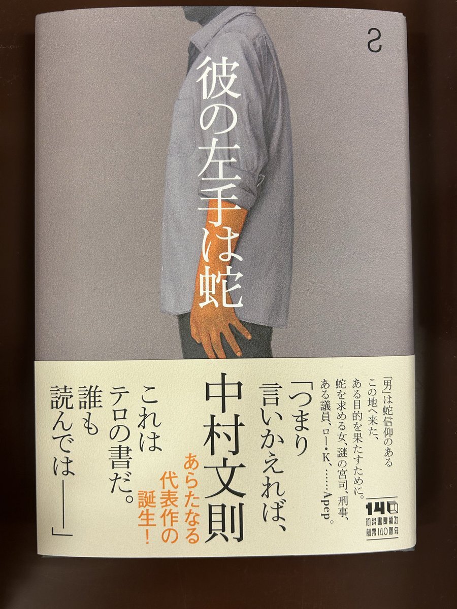 🐍#彼の左手は蛇🐍 主人公は手記を書く。自分の正常を委ねるため誰も読まない手記を。蛇を祀る神社、日本の神話、ギリシャ神話… 巳年に巳年生まれの #中村文則 先生が書く蛇にまつわる物語。静けさの中に強烈な印象を残すあらたなる代表作‼️ サイン本少しいただいています📕✨ #河出書房新社 pic.x.com/uz5DJ8qQid