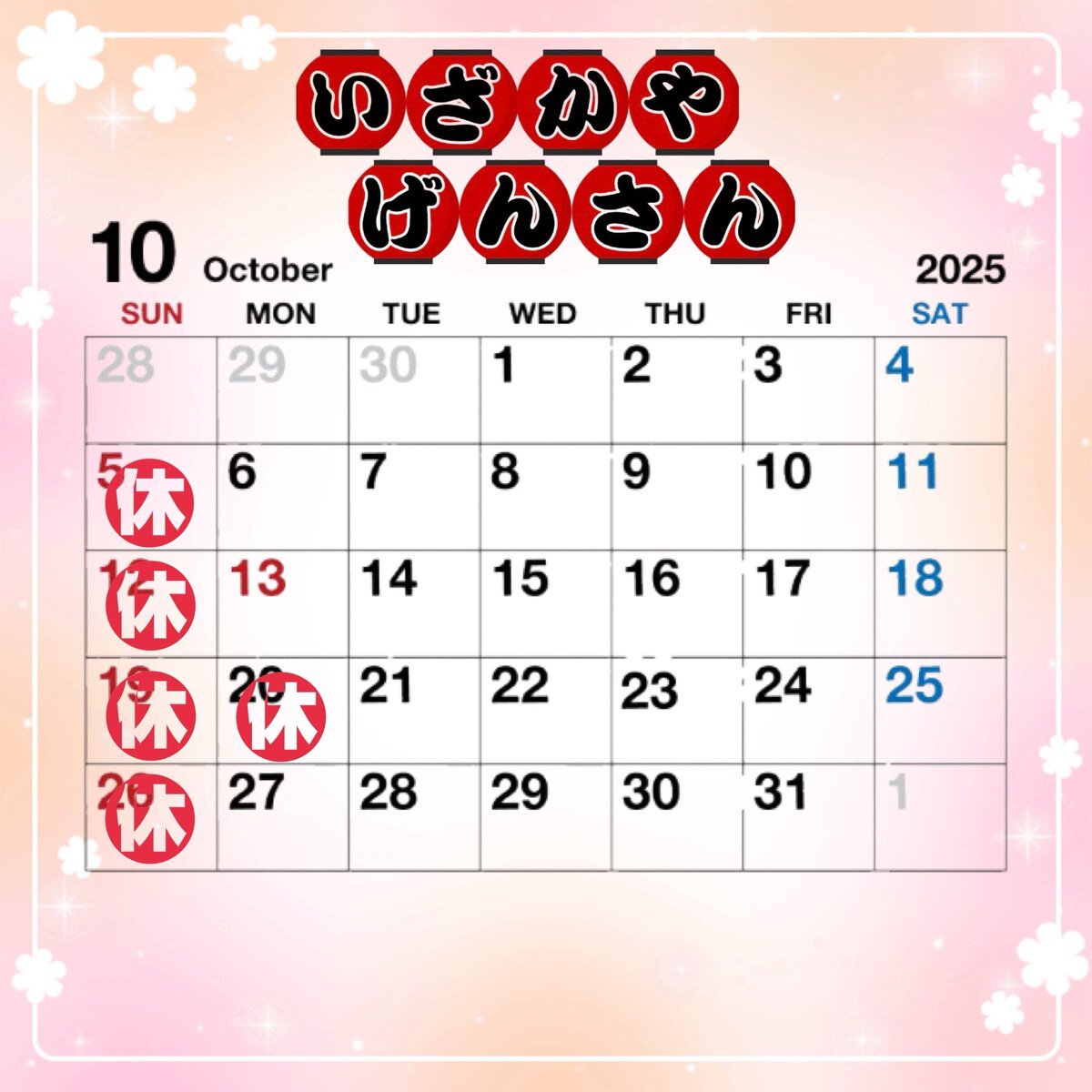 2025.10.1(水) 10月の営業日をお知らせいたします みなさまのお越しをお待ちしております 北区滝野川6-40-8 #いざかやげんさん #居酒屋 #滝野川 #板橋駅 #新板橋駅 #西巣鴨駅 #御代の台仲通り商店街 #喫煙可能店 pic.x.com/PaI1oVIIIj