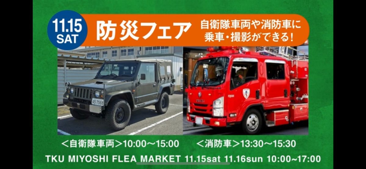 \菊池所からのお知らせ/ 11月15日(土)#TKU御代志住宅展示場 で開催される「TKU MIYOSHI FLEA MARKET」に参加します #防災フェア では、自衛隊警務隊の車両も展示します 自衛隊の疑問にもお答えしますので、ぜひお越しください😆 #TKU #防災 #TKU御代志住宅展示場 #イベント #熊本 #合志市 #御代志 pic.x.com/r6N6GWZqNL