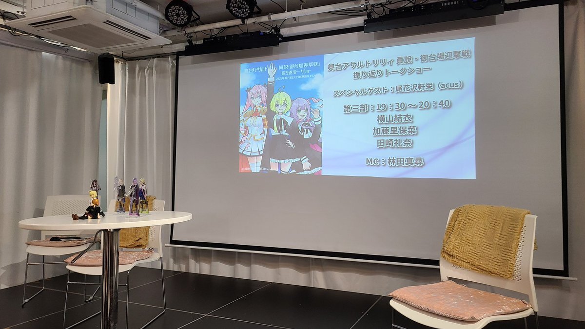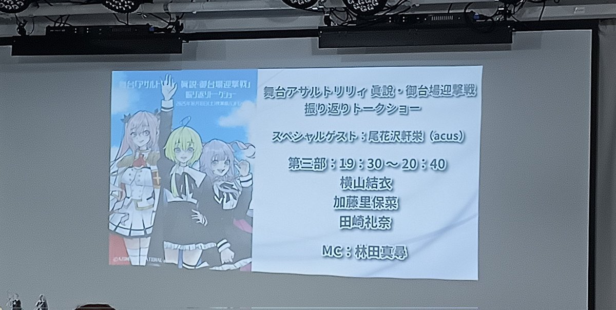 本日の現場その3はこちら。 #舞台アサルトリリィ - 眞說 ・ #御台場迎撃戦 - 振り返りトークショー第3部。 さて、このメンバーで収拾はつくのだろうか? #迎撃戦振り返りトークショー pic.x.com/Yn92dwVjkW