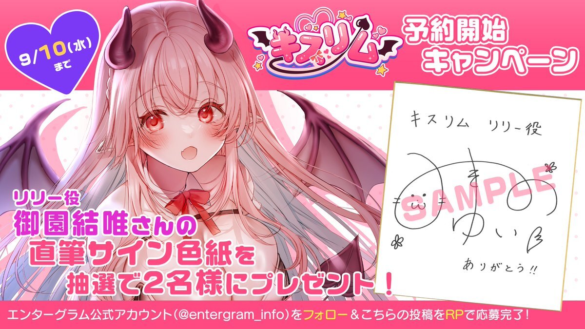 【予約開始記念RPキャンペーン】 『キスリム』の予約開始を記念して ヒロイン・リリー役 御園結唯(@misono_1616)さん のサイン色紙が当たるRPキャンペーンを開催 いします! こちらのアカウントをフォロー&RPで抽選で 2名様にプレゼント💖 x.com/entergram_info…