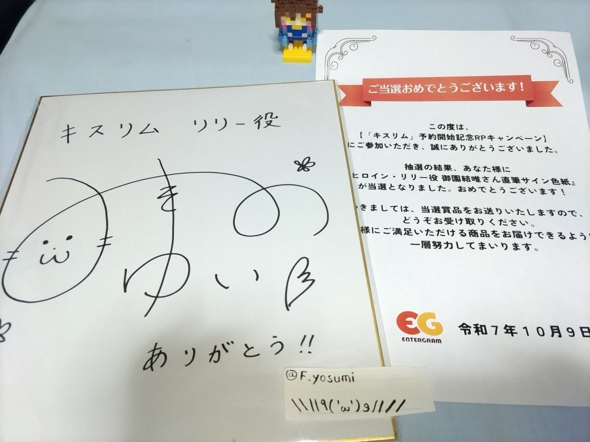 と、いうことで。 キスリムの予約開始キャンペーン、御園さんの直筆サイン色紙当選しておりました。 今まで御園さんのこういうキャンペーンいろいろあったけど、当選したのは初めて(アマギフは除く)でほんと嬉しいです。ありがとうございます。 とりあえず額縁買います。 #キスリム #御園結唯 x.com/entergram_info…
