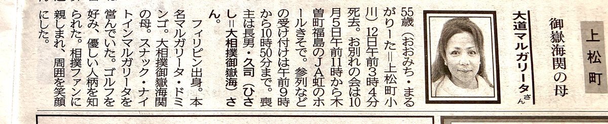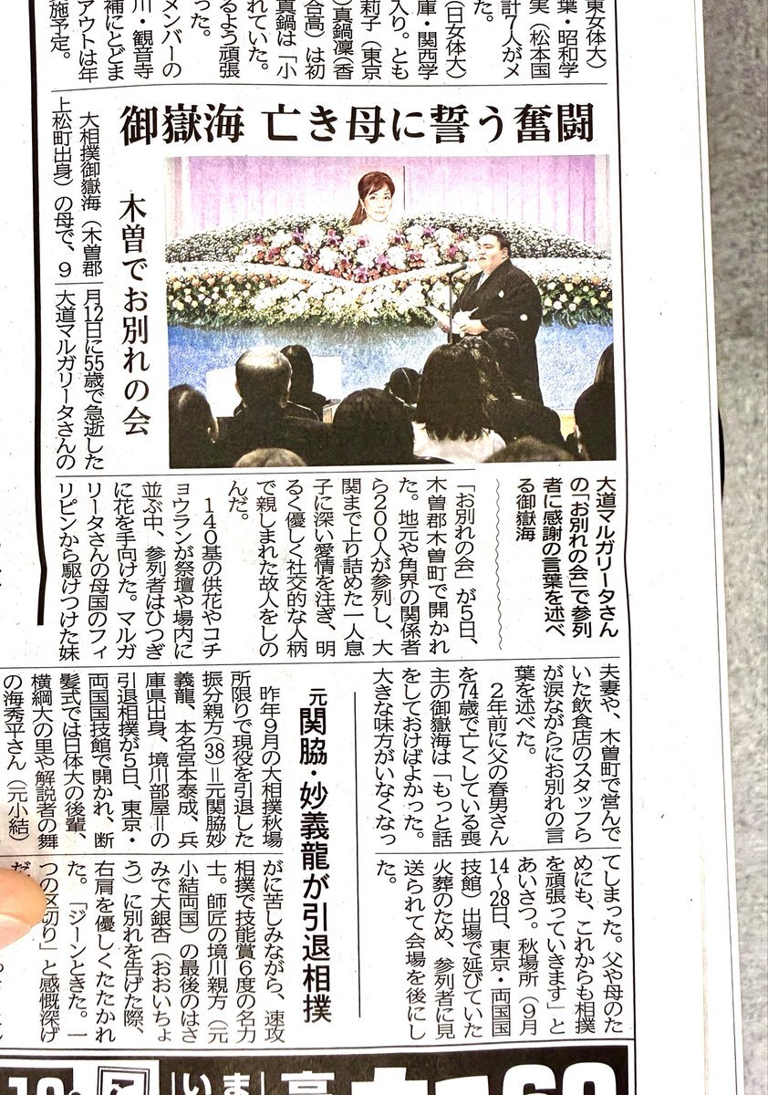 御嶽海関「大きな味方がいなくなってしまった」 木曽町で母マルガリータさんのお別れ会 誓った奮闘|信濃毎日新聞デジタル #御嶽海 #大相撲 #上松町 shinmai.co.jp/news/article/C… shinmai.co.jp/news/article/C…