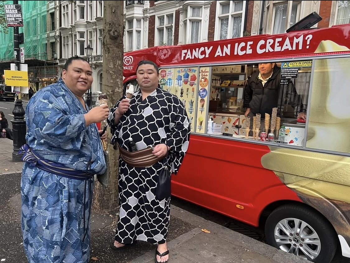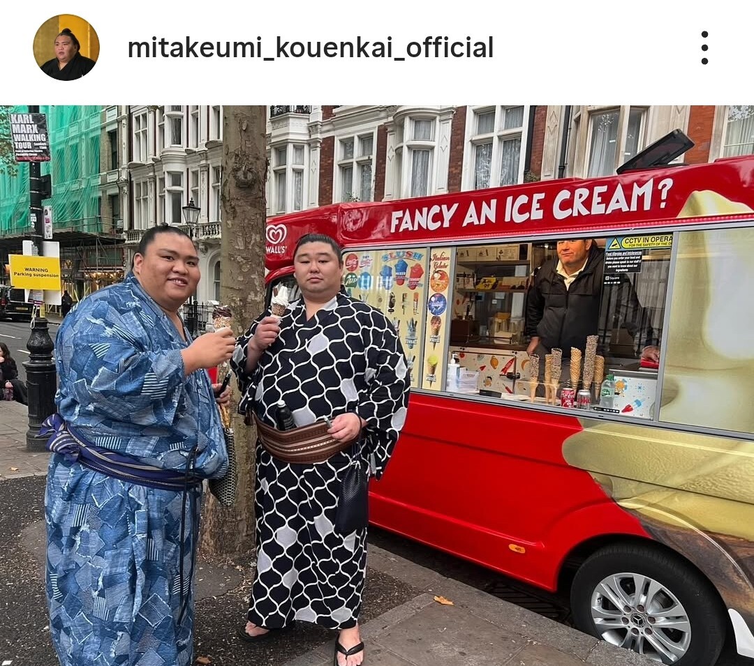 み~たん 良い顔してる😁 ほっとする☺️ 二人で美味しそう🍦 御嶽海後援会インスタから アップして下さりありがとうございますm(_ _)m #御嶽海 #正代 #ロンドン巡業 pic.x.com/u1k7soQO60