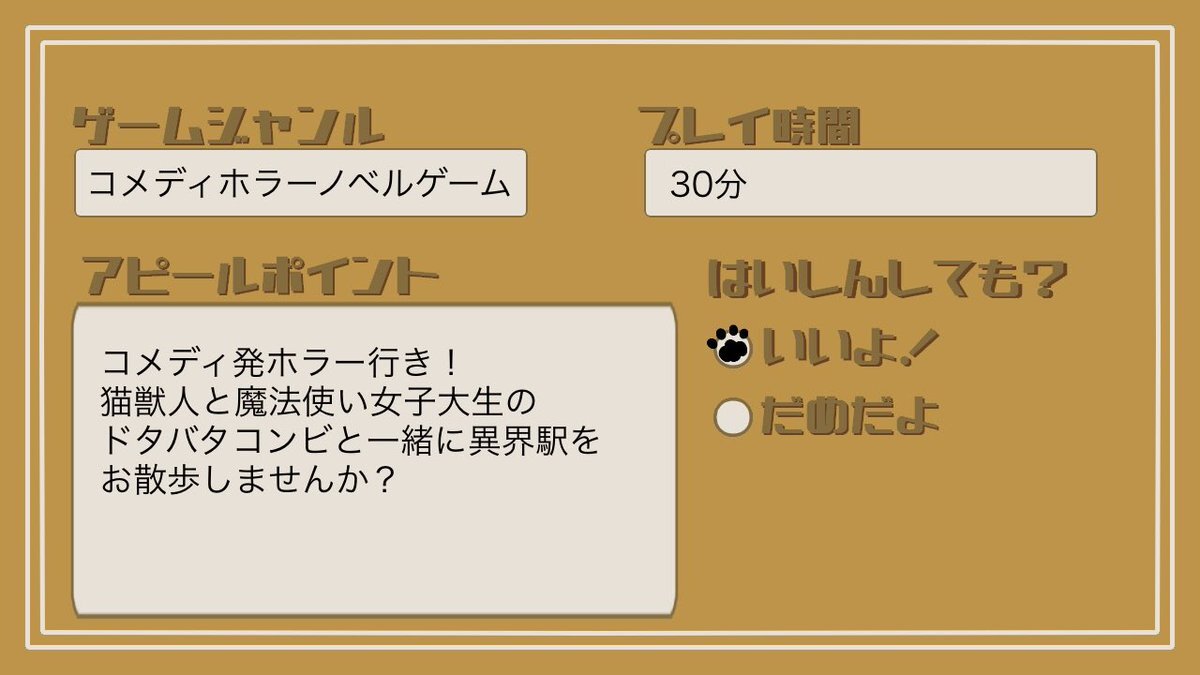 #自作から摂取できる栄養 ・やかましいコンビ ・しわしわ顔の不憫猫獣人 ・ニッコニコのイカれた女子大生 ・コメディ発ホラー行き ・解明しない謎空間 ・戸惑う選択肢 ・容赦のないエンド #フリーゲーム #御気楽異界御散歩倶楽部 pic.x.com/R1CAOnfawK