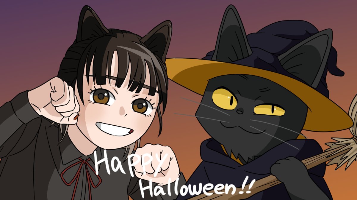 ハロウィン絵その3、当日は! 魔法使い⇔猫取り換えっこなキュウショウ&ヒナツでハッピーハロウィン!! ハロウィンナイトに大騒ぎ系ホラーはいかがでしょうか👻 #御気楽異界御散歩倶楽部 #フリーゲーム novelgame.jp/games/show/117… pic.x.com/pQZvMMdeaq