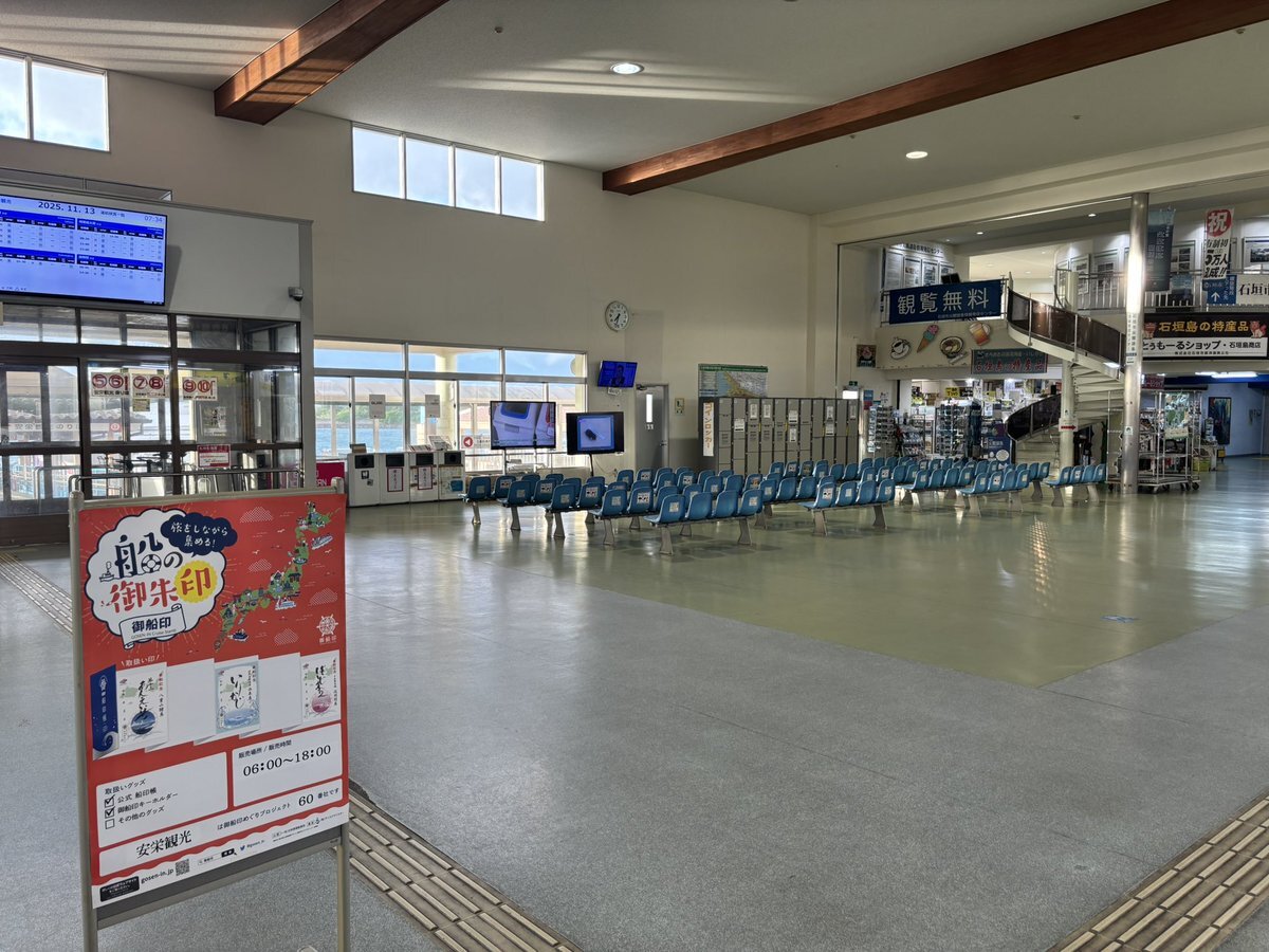 おはようございます🌀 石垣停泊「いりかじ」⬅️御船印 今日は台風フォンウォンの影響により全便欠航となっています❌ 離島ターミナル内もお客様がいなく静かです😅 天気は風はそこそこ強いですが晴れています☀️ #安栄観光 #御船印 pic.x.com/uMAk5nav2Q