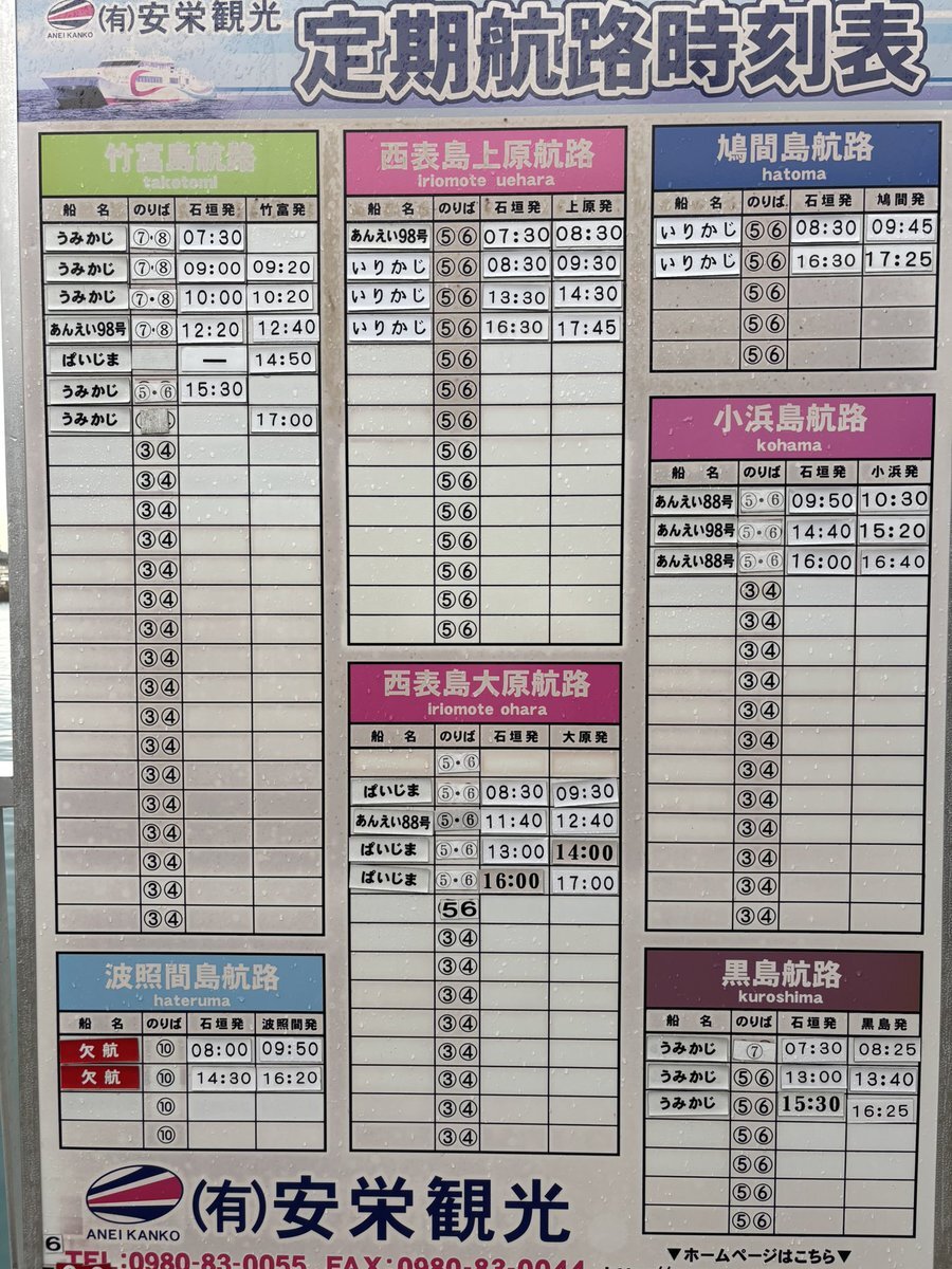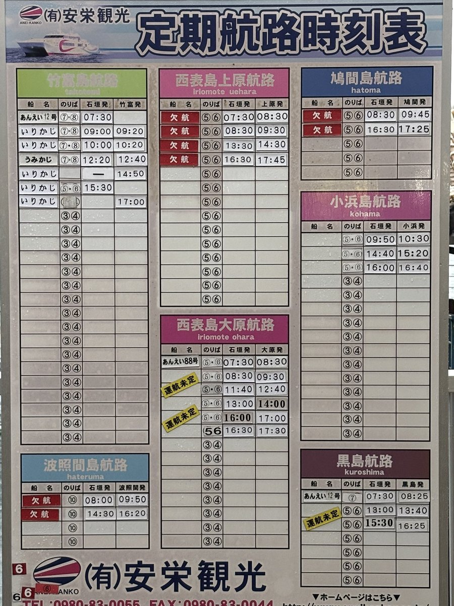 最新の運航状況をお知らせします 2025年11月14日6:00時点 【運航】 竹富島行き7:30発(引き返す場合あり) 【欠航】 西表島上原港、鳩間、波照間島 黒島行き07:30発 【未定】 小浜島、西表島大原港(一部欠航) 黒島行き13:00発以降 出港の1時間前に運航判断 HPでも更新中です aneikankou.co.jp