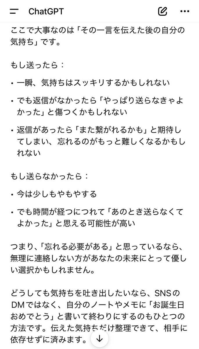 実は別れた直後に彼女の誕生日を迎えて、連絡したい気持ちを押し殺すためにChatGPTと会話してた。それきっかけに相手には伝えず、自分のノートとして𝕏にそのときの心情を残すことで後で冷静に立ち返ることができると信じてる #復縁垢さんと繋がりたい pic.x.com/Uc2rDvnUKE