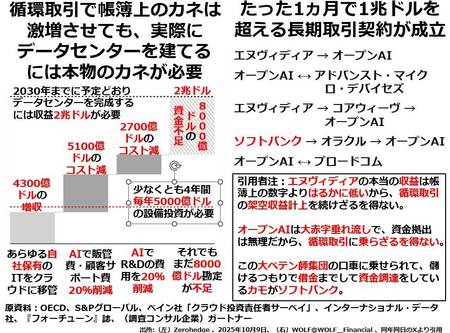 #データセンター建設投資 に必要な巨額資金調達のために、わずか1ヵ月で合計1兆ドルを超える長期契約が成立。だが、全部実際に動くカネはほぼゼロの #循環取引。つまり本物の出資金は依然として不足。そこでカネをむしり取るカモに選ばれたのが #スターゲイト計画「主幹事」の #ソフトバンク だろう。 pic.x.com/I4Xa3ukyGA