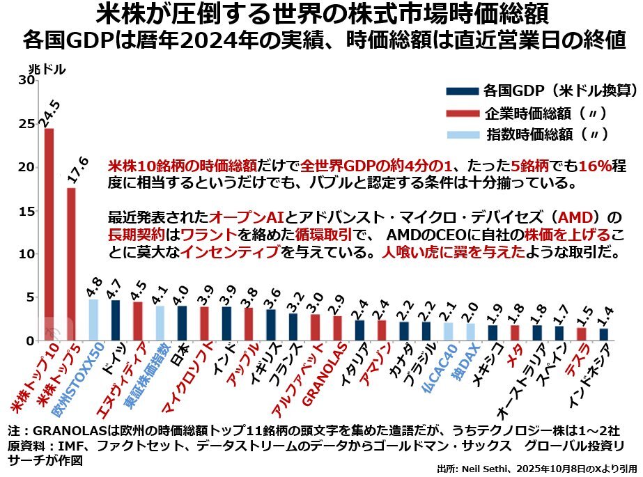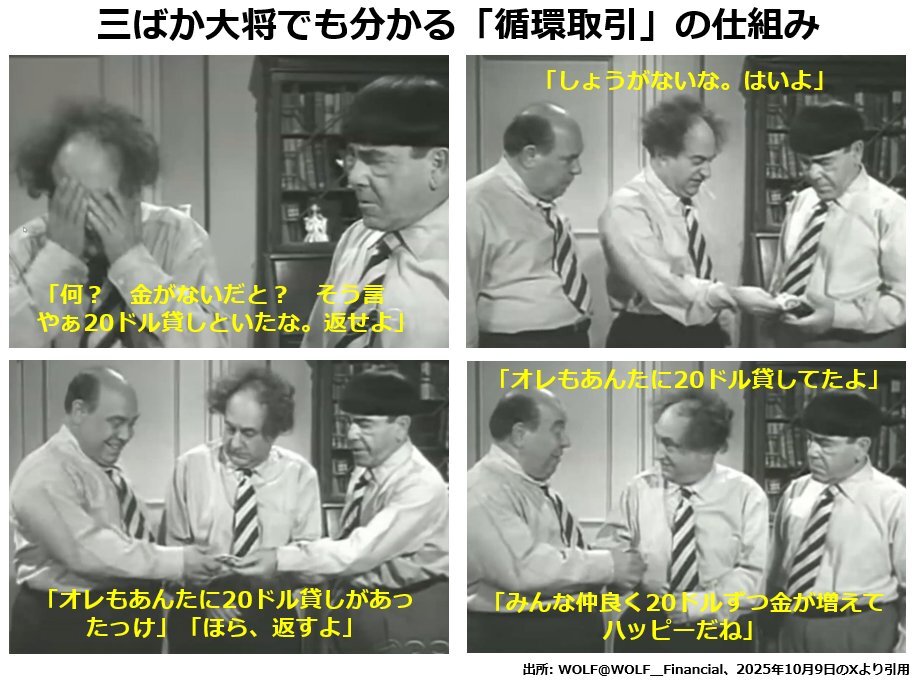 #ゴールドマン・サックス は、わざわざ左図のようなグラフを持ち出して「#企業業績 が伸びているからまだ #バブルではない」と主張。だがその業績の伸びの多くは、#エヌヴィディア の公然たる #循環取引 による架空の収益がもたらしたものだ。最近は #オープンAI も堂々と循環取引。バブル崩壊は近い。 pic.x.com/HxgGUAznsP
