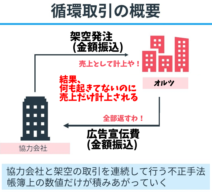 ちなみにオルツの架空計上(循環取引)が どんなものか簡単に説明すると、こう。 これで売上があったように見せかけてたわけ。 これは狙ってやらんと無理。 米倉千貴は詐欺師。社長辞任で済む話じゃあ無い。 てか、新興の上場審査がザルすぎる。 #循環取引 #架空計上 #オルツ pic.x.com/ncMbrH6IrZ