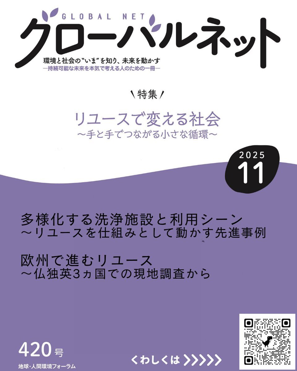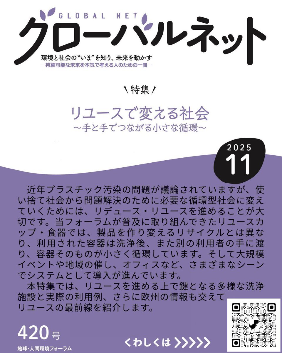 地球・人間環境フォーラム(GEF)が発行する環境情報誌『グローバルネット』11月号の特集は「リユースで変える社会~手と手でつながる小さな循環」gef.or.jp/category/globa… #グローバルネット #リユース #脱プラスチック #2R #脱使い捨て #循環型社会 #サーキュラーエコノミー #2R pic.x.com/AZRYVi0b7F