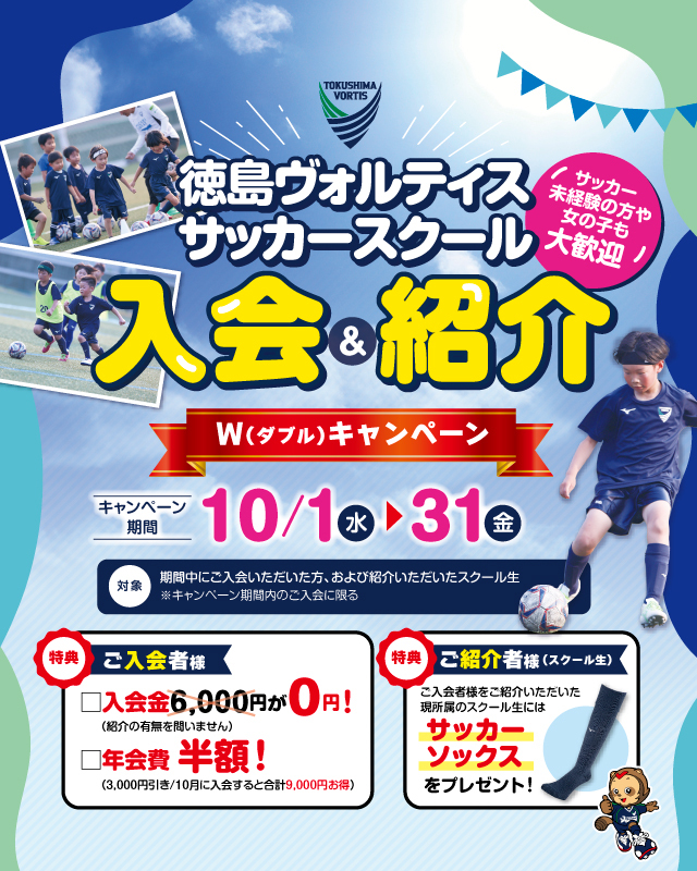 \ 一緒にサッカーしよう⚽! / #徳島ヴォルティス サッカースクールでは、10/1(水)~10/31(金)の期間に「入会&紹介Wキャンペーン」を実施します! 紹介いただいた方、紹介で入会いただいた方両方にお得なキャンペーンです🍀 詳細はこちら ▶vortis.jp/news/13066/ #vortis x.com/vortis_pr/stat…