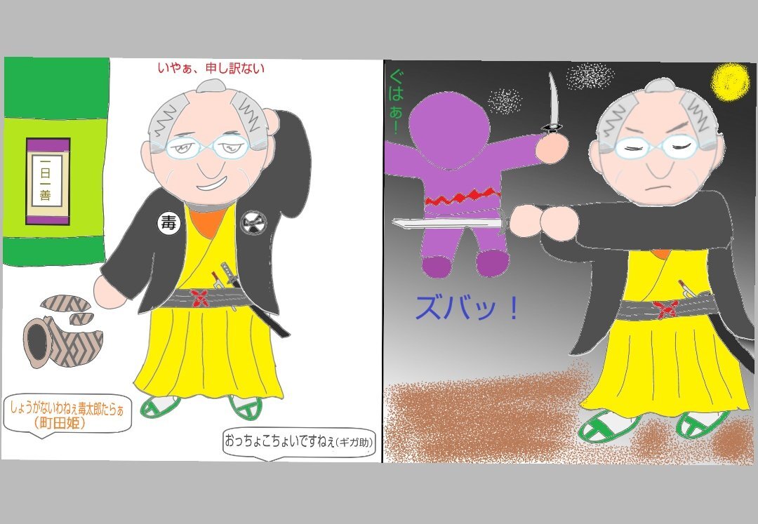 普段は慌てん坊で、おっちょこちょいの毒太郎。 町田姫やギガ助から、その事でちょくちょくいじられる。 しかし裏では人を苦しめる悪を成敗する仕事人の毒太郎なのだぁー! (想像して描いてみました😊) #毒多博士 #必殺仕事人 pic.x.com/E7ua4sJlON
