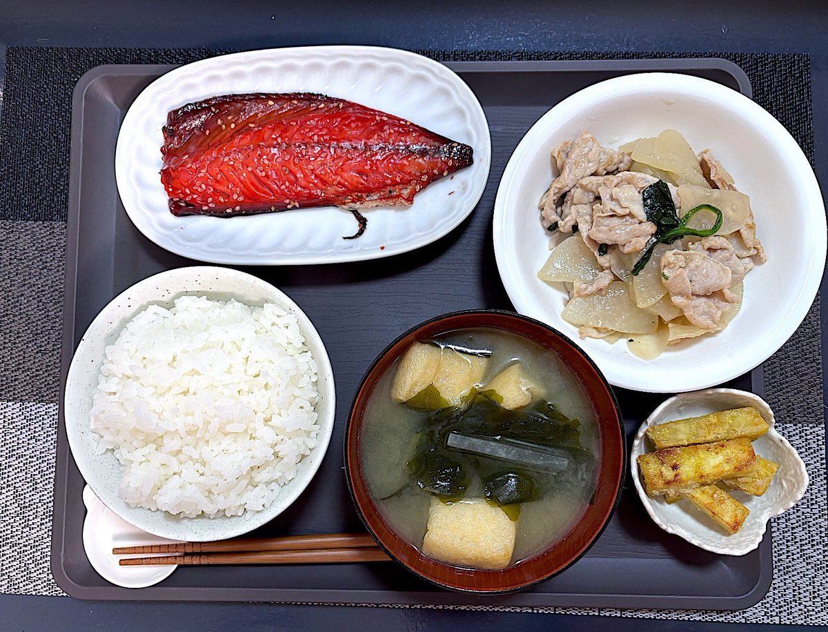 今日の夕食 ・鯖のみりん干し ・大根と豚肉の塩ダレ炒め ・大根とワカメの味噌汁 ・さつまいもの塩バター #今日の夕食 #忍たま乱太郎の食堂おばちゃん pic.x.com/61lBCWv19D