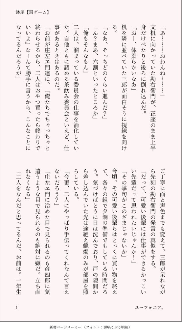 #鉢尾版ワンドロワンライ 鉢尾【罰ゲーム】 1h +15min 「負けた者は、勝った方の言うことを何でも一つ聞くこと」 🦊の挑発まがいの誘いを、🍡は受け入れる。 勝者はどちらか、命令は一体。