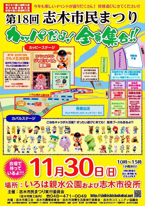 今週末!! 11月30日(日) 「第18回 志木市民まつり」 今年も司会を務めさせて頂きます♪ カパル(@Shiki_kapal)に久しぶりに会えるの楽しみ〜🥰❤️ ご当地キャラちゃんも大集合するよ〜❣️